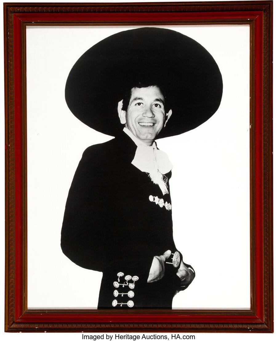 Trini Lopez Large Format Early 60s Personally Owned Photo. A large black and white photo of Trini, custom framed to an overall 25 ¾" x 31 ¾". In Very Good Plus condition with spots of creasing on the print and various chippings on the frame. COA from Heritage Auctions.