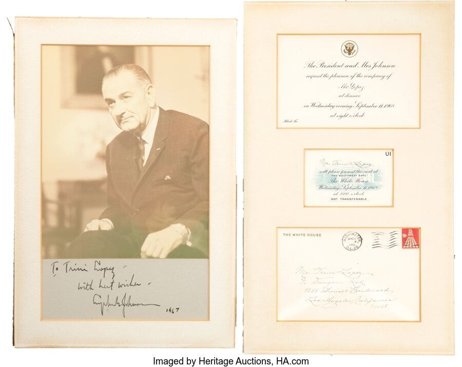 Trini Lopez Owned Bust of JFK Gifted by LBJ With Signed Photo. Three items owned by Trini with ties to the JFK/LBJ administration. Includes: 1)A hefty green bust of John F. Kennedy, gifted to Trini from Lyndon Baines Johnson not long after JFK died. Measures approx. 10 ½" tall and 6" wide. Housed on a brown wood block. In Very Good Plus condition with various chippings; 2)A matted photo of LBJ with the inscription "To Trini Lopez / with best wishes / Lyndon B. Johnson / 1967." Written in dark ink from a felt. Measures 9 ½" x 14 ½". In Very Good condition with toning on the matte and backing board; 3)An invitation to Trini from the White House for a dinner on September 11, 1968. Comes with original envelope and matted to an overall 9 ¼" x 15 ½". In Very Good Plus condition with some toning throughout. COA from Heritage Auctions.