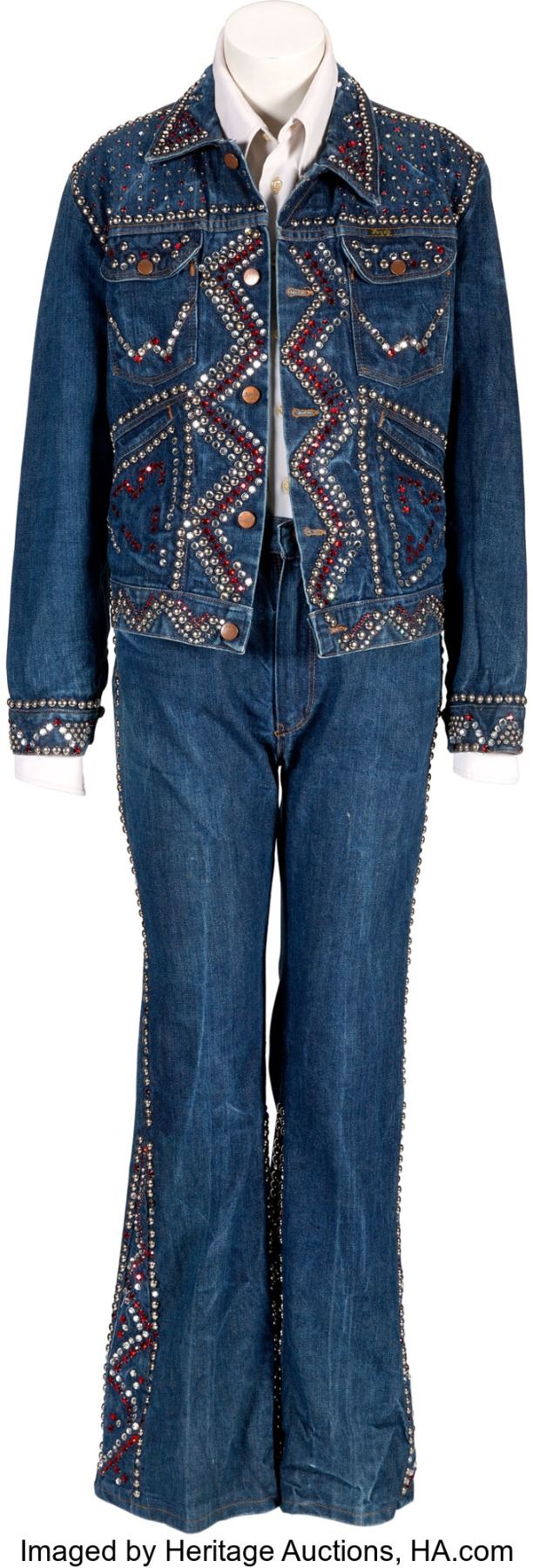 Trini Lopez Owned Denim Studded Jacket, Jeans, and Shirt. A three-piece suit from Trini Lopez. Includes: 1)Blue denim Wrangler jeans, studded with red, white, and silver. 31" x 36" size. In Very Good Plus condition; 2)Blue denim Wrangler jacket, studded with red, white, and silver. Size 40. In Very Good Plus condition; 3)A white button-down long-sleeved shirt with no label. Measures 18" from armpit to armpit, and 25" sleeve. In Very Good condition with some spots of soiling and toning. There are missing beads, along with very dirty loose threads. COA from Heritage Auctions.