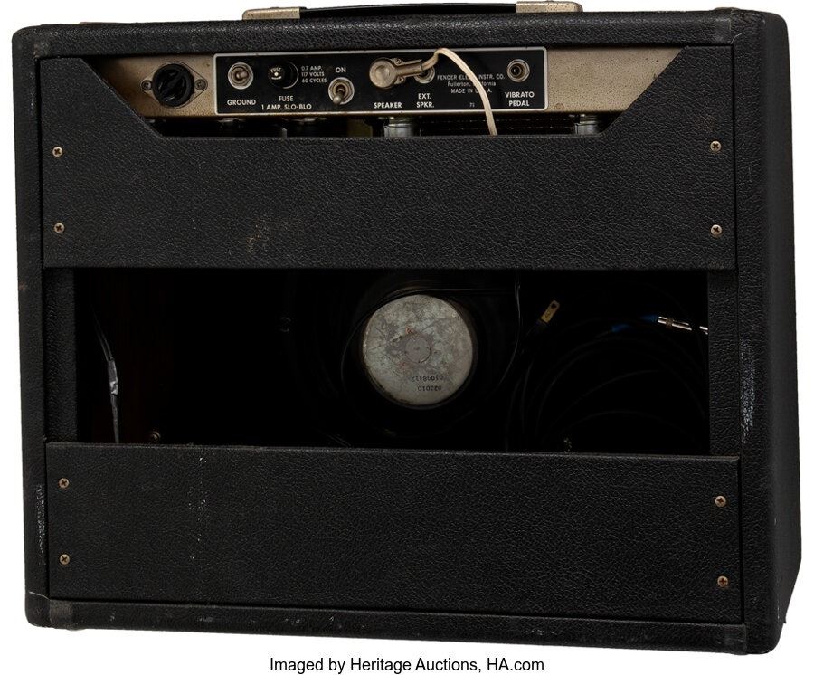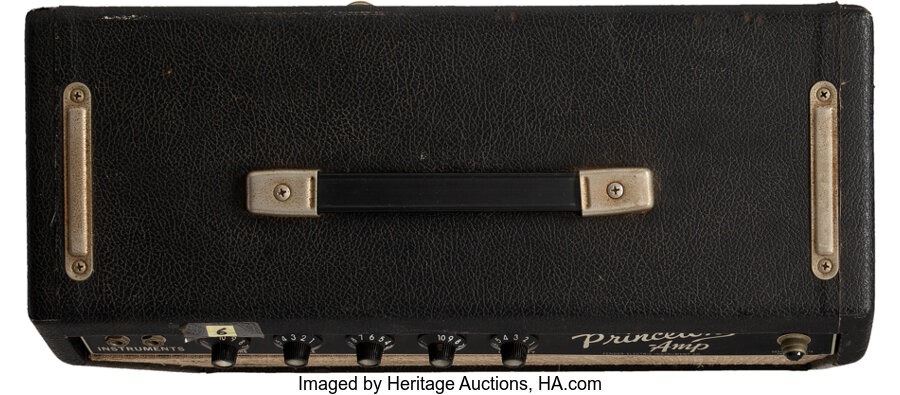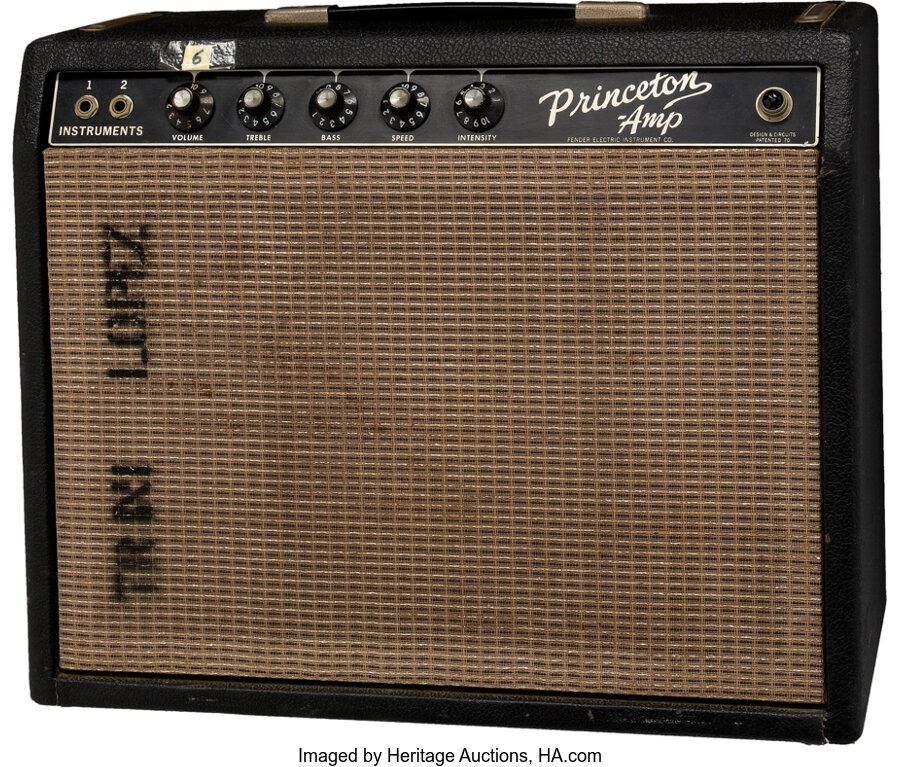 Trini Lopez Owned Fender Princeton Electric Guitar Amplifier. A Princeton amplifier (made by Fender) with "Trini Lopez" spray-painted in black on the cover of the amp's single speaker. Tube amp. Has knobs for volume, treble, bass, speed, and intensity. Has two inputs for instruments. Works when plugged in. Measures approx. 7 ½" x 16" x 20". In Very Good condition with wear and usage. COA from Heritage Auctions.