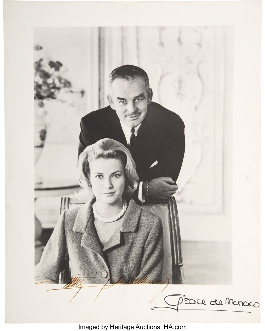 Trini Lopez Owned Grace Kelly/Rainier III Signed Photo. A 9 ½" x 12" black and white photo from Trini's friends Grace Kelly and her husband Rainier III, both signed in the bottom portion. The prince's signature is in faded ink while Kelly's signature is fully intact with a thin black felt tip. Photo is in Very Good Plus condition with corner bumping and light toning around the edges. COA from Heritage Auctions.