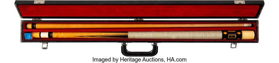 Trini Lopez Owned Pool Cue and Photo. A pool cue (with an engraved "Trini") housed in two parts in a black case. Case is in Very Good condition with severe wear in various spots (namely, spots and scratches), but the cue is in Near Mint Minus condition. Comes with a blue chalk square. Lot also comes with a framed color photo (measures 10 ¾" x 8") of Trini playing pool with a different cue. COA from Heritage Auctions.