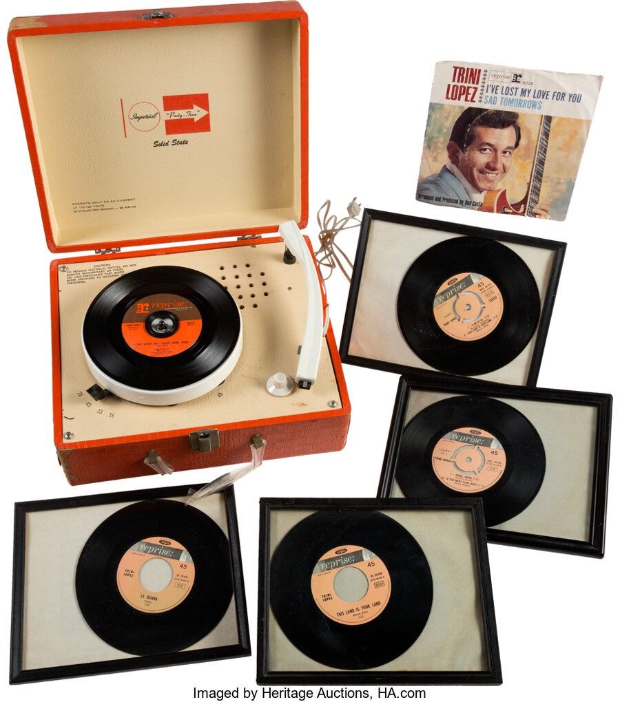Trini Lopez Owned Record Player and 45s. Six items from Trini in this lot, including a personal record player and five 45s. Includes: 1)An orange-colored Imperial "Party-Time" portable record player. Does not appear to be in working condition. Clear handle is broken. In Good condition with soiling, peeling, loss, and wear on the exterior; 2)Four framed 45s, all from the Reprise catalog ("This Land is Your Land," "La Bamba," "Green, Green," and "America"). All appear to be in NM 8 condition. Frames are loose from glass. Also includes a copy of "Sad Tomorrows"/"I've Lost My Love For You" (Reprise 0328). Sleeve is in GD-VG 4 condition and the disc is in EX 7 condition. COA from Heritage Auctions.