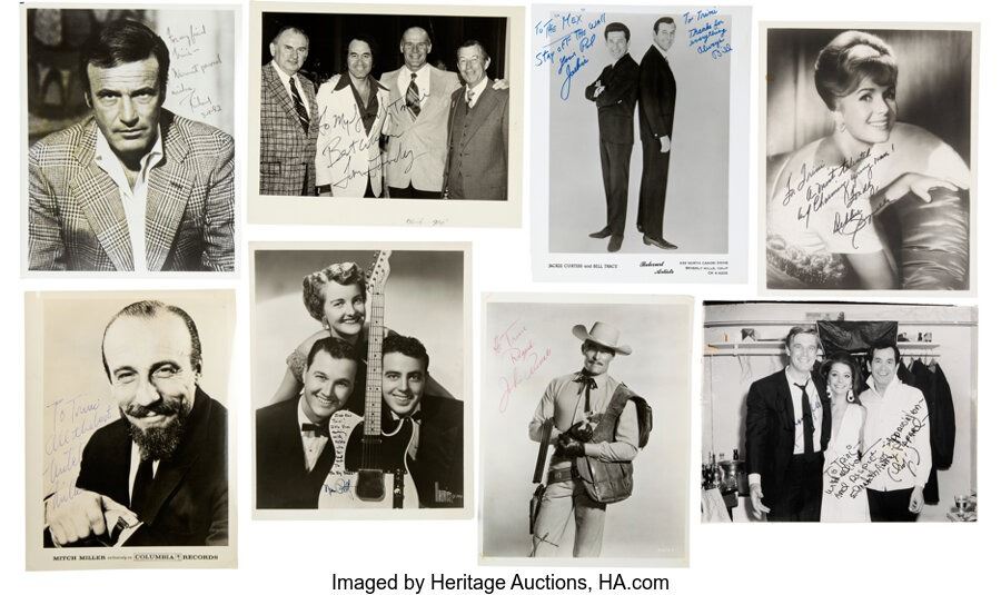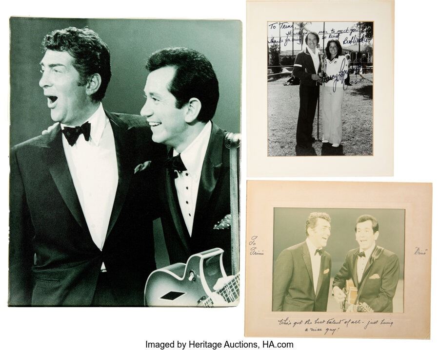 Trini Lopez Owned Signed and Inscribed Items from Dean Martin, Debbie Reynolds, George Peppard, Tom Landy, and Others. A collection of 11 items, ten are signed by various celebrities, in various sizes. The one unsigned item is a large photo of Trini with Dean Martin on a vinyl-like material that measures 16" x 20". The signed and inscribed items (all photos) include: 1)Tom Landy; 2)Mitch Miller; 3)Norman "Norm" Petty; 4)John Russell; 5)Jackie Curtis and Bill Tracy; 6)Debbie Reynolds; 7)Elizabeth Ashley and George Peppard; 8)Richard Anderson; 9)A matte signed and inscribed by Dean Martin; 10)Nancy Lopez. Overall, in Very Good condition with various creasing and toning, with some picture peeling and folding. COA from Heritage Auctions.
