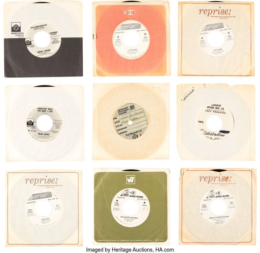 Trini Lopez Personally Owned 45s (22). A collection of 20 45s, all personally owned by Trini. Most grade from EX 7 to NM 8. Most are white label promos. Includes a UK acetate of "I Wanna Be Around" that grades to VG EX 6. Others include: "Satisfaction," "Malagueña Salerosa" (in VG-EX 6 condition), "Something ‘Bout You Baby I Like," "Good Old Mountain Dew," "Together," "Noche De Paz," "Sha-La-Boom-Boom-Yeah," "Up to Now," "Up to Now," "It's A Great Life," "Sally Was a Good Old Girl," "Let's Take a Walk," "The Bramble Bush," "In the Land of Plenty," "Love Story," "Come A Little Bit Closer," "Five O'Clock World"/"You Make My Day," "Together"/"I Wanna Be Free," "Together"/"I Wanna Be Free." COA from Heritage Auctions.