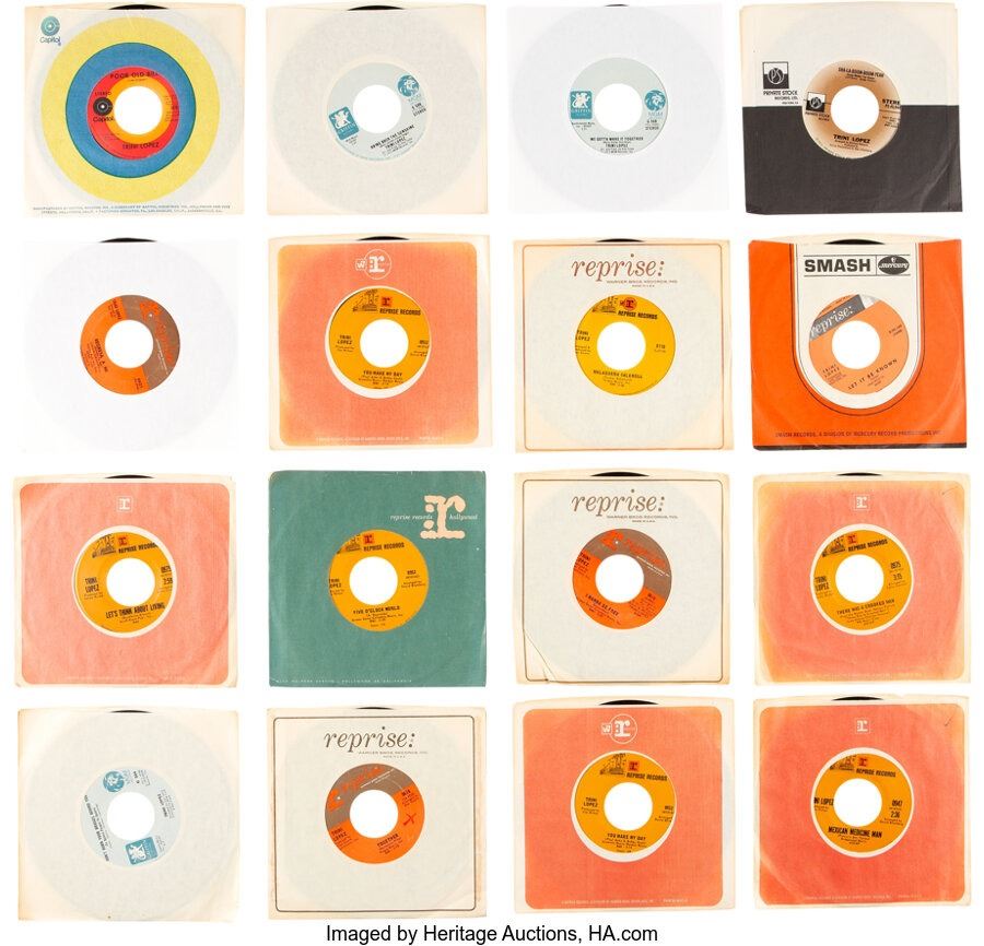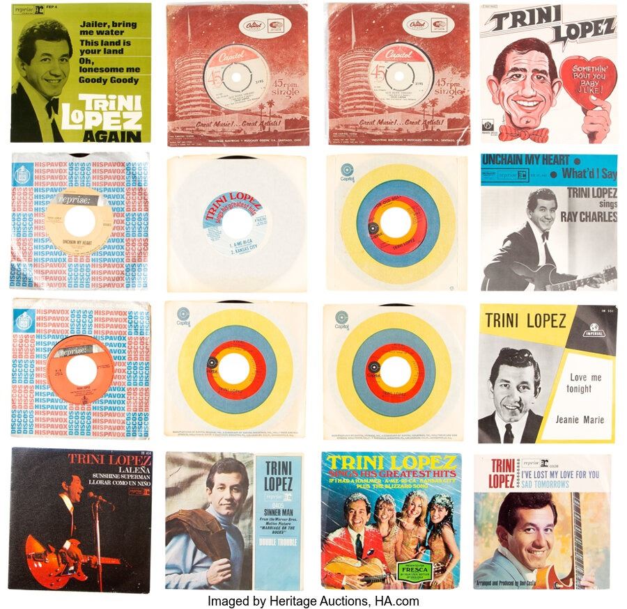Trini Lopez Personally Owned Import 45s (39). A collection of 39 vinyl singles from all over the world, personally owned by Trini. On various labels. All ten imports grade between EX 7 to NM 8 condition and come from the following countries: New Zealand, Chile, Japan, Holland, and France. The remaining 29 are from the United States, and grade from EX 7 to NM 8. COA from Heritage Auctions.
