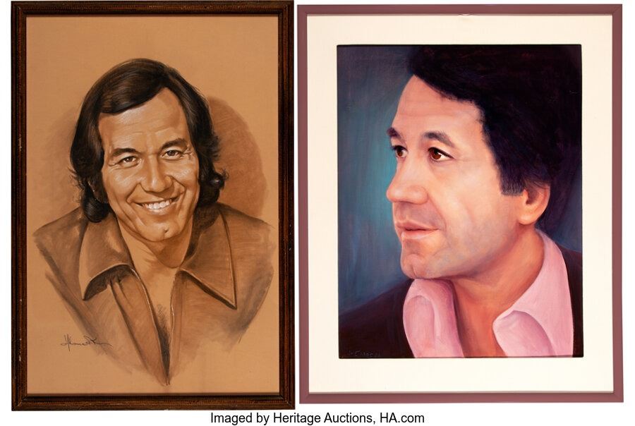 Trini Lopez Personally Owned Portrait Paintings (2). A collection of two large paintings of Trini. Includes: 1)A portrait from 1986 (with a lengthy inscription and signature from the artist on verso). Framed to an overall 30 ½" x 37 ½". In Near Mint condition; 2)A portrait that measures to an overall 26 ¾" x 38 ¾". In Very Good condition with many tears on the backing paper and chipping on the frame. COA from Heritage Auctions.