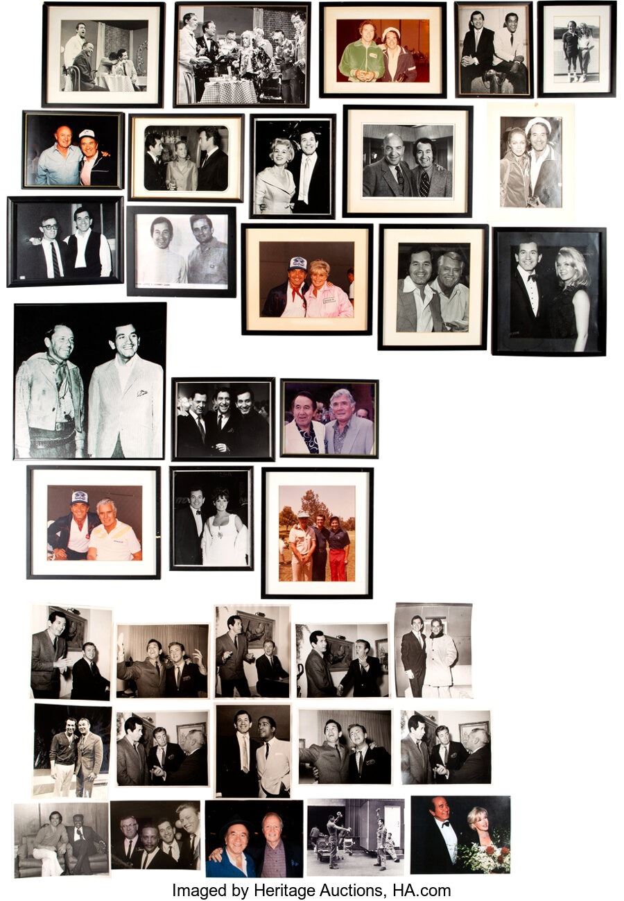 Trini Lopez Pictures With Various People Including Bobby Darin, Frank Sinatra, Soupy Sales, and Others (36). A grouping of 20 framed photos and 16 unframed photos of Trini with various celebrities, all in various sizes. Includes: 1)A large format photo from the set of 4 For Texasfeaturing Frank Sinatra. Measures 16" x 16 ½". In Very Good Plus condition with adhesive loss on the backing board; 2)Seven unframed photos with Bobby Darin, and two pictures with Sinatra and Soupy Sales. Have a lot of wrinkling/creasing; 3)Nine unframed and thirteen framed photos with various celebrities like Clint Eastwood, Tony Randall, Roy Rogers, Jon Voight, Sammy Davis, Jr., Fats Domino, and Johnny Cash. In various condition. The unframed photos have a lot of wrinkling/creasing. Overall, in Very Good condition. COA from Heritage Auctions.