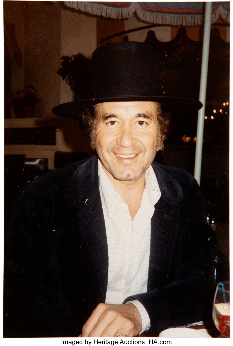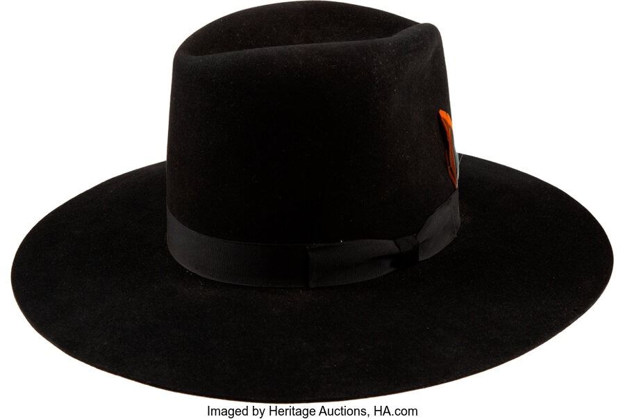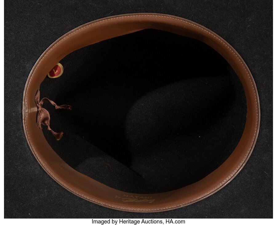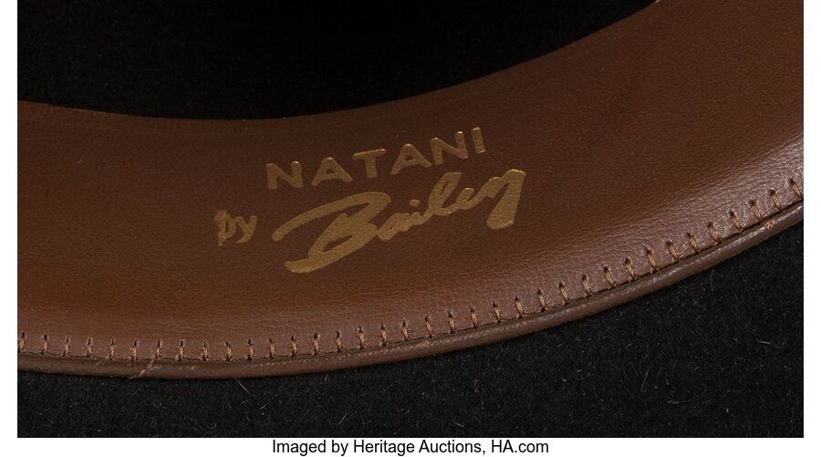 Trini Lopez Stage Used Hat. A black hat (with a color photo of Trini wearing it) used onstage by Trini. Has "Natani / by Bailey" printed on the interior. Measures 16" in diameter, and 6 ½" tall. Size 7. In Near Mint condition. COA from Heritage Auctions.