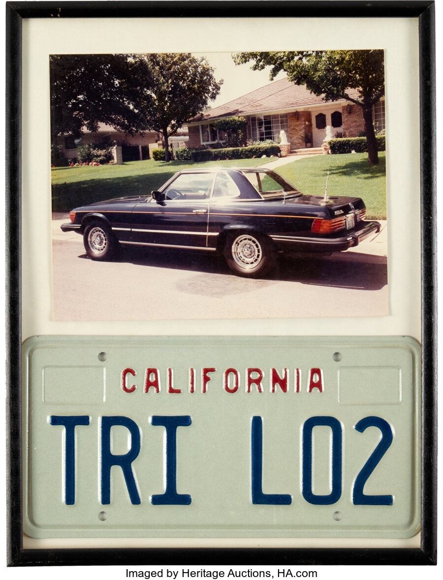 Trini Lopez Vanity California License Plate. Housed in a frame (that measures 12 ¾" x 16 ¾") with a color photo of the Mercedes attached to it, this is Trini's California vanity license plate. In Very Good condition with tape on backing board. COA from Heritage Auctions.