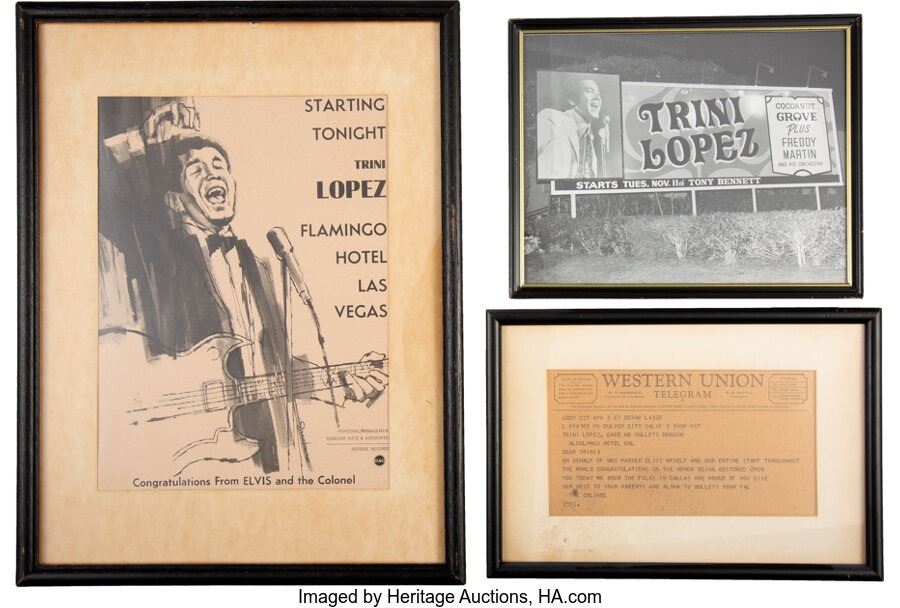 Trini Lopez Western Union Telegram From Colonel Tom Parker With Congrats From Elvis and the Colonel. Three items are in this lot: 1)Dated April 3, 1967, this Western Union telegram is from Elvis' manager. Framed and matted to an overall 7 ¾" x 11 ¼". Overall, in Very Good condition with toning throughout; 2)A black and white photo of a billboard for Trini's appearance at Cocoanut Grove, framed to an overall 8" x 10". In Very Good Plus condition; 3)With a "Congratulations from Elvis and Colonel" on the bottom edge, this is promo poster for Trini Lopez appearance at the Flamingo Hotel in Las Vegas. Matted and framed to an overall 13" x 17". In Very Good condition with toning throughout. COA from Heritage Auctions.