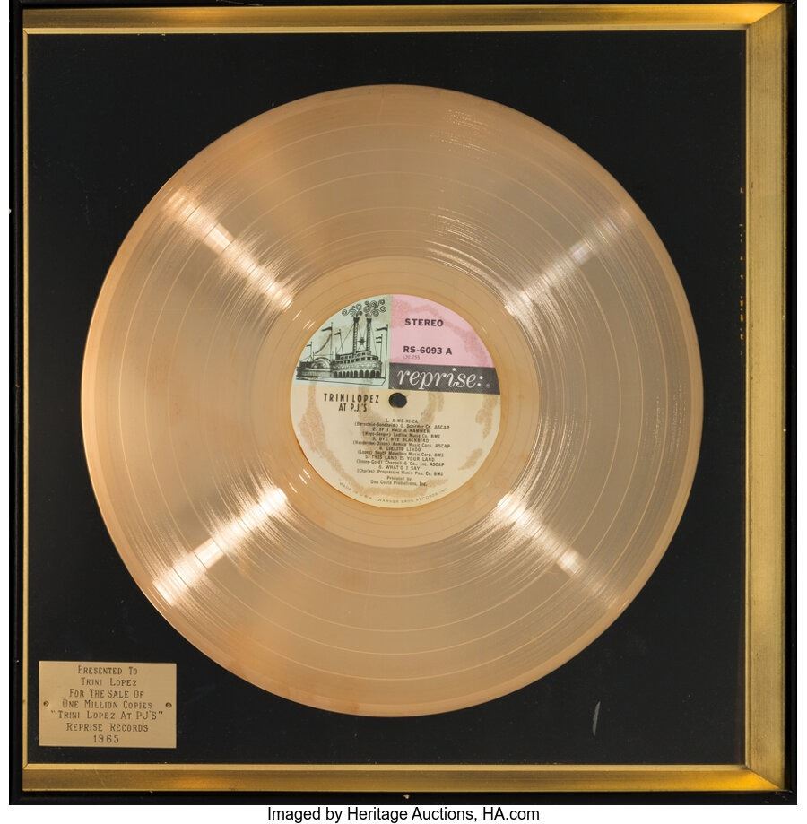 Trini Lopez at PJsPersonally Owned In-House Gold Sales Award. An in-house gold sales award for Trini's live album, released in 1963. According to the plaque in the bottom left corner, "Presented To / Trini Lopez / For the Sale of / One Million Copies / ‘Trini Lopez at PJ's' / Reprise Records / 1965." Measures 15 ½" square. In Very Good condition with tape on backing paper, along with scratches on the frame. COA from Heritage Auctions.