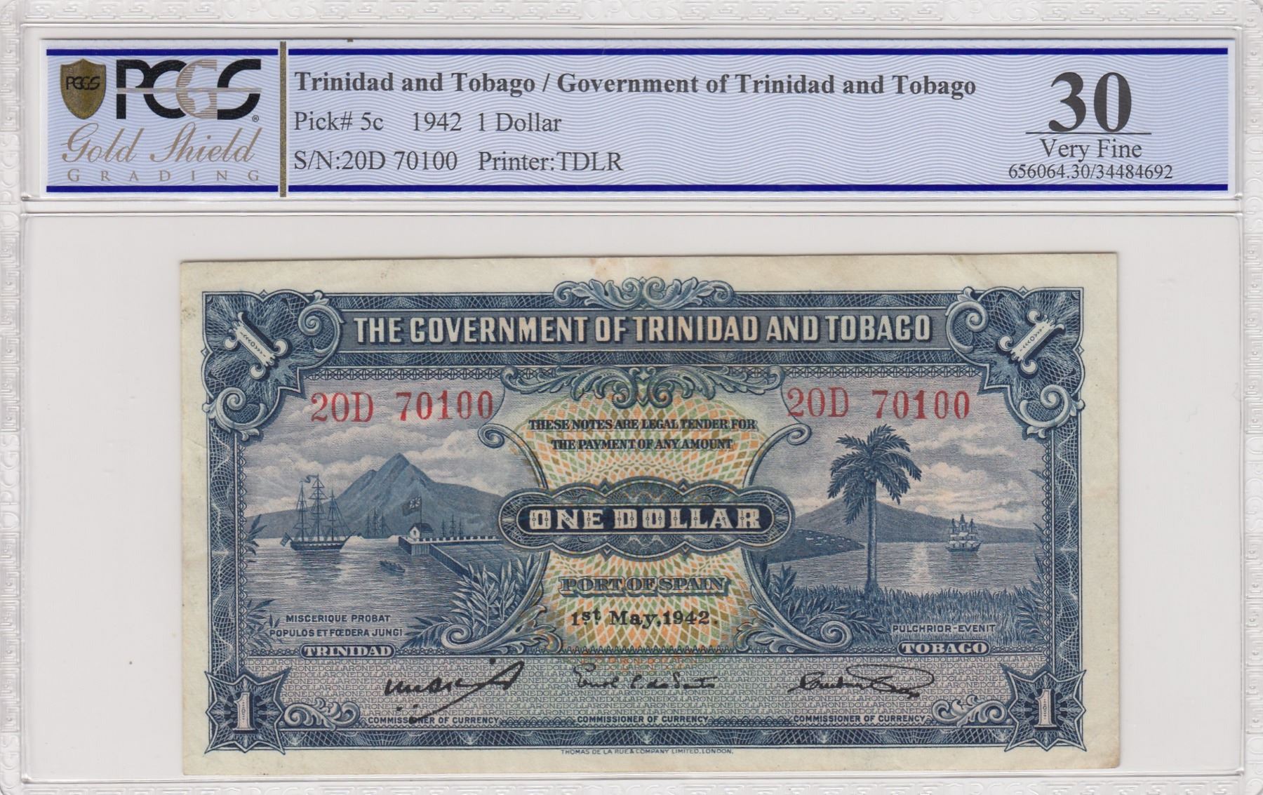 Trinidad and Tobago, 1 Dollar, 1942, VF, p5cbr/PCGS 30, serial number: 20D 70100