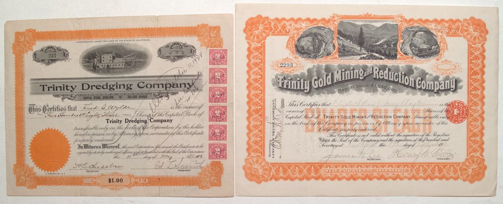 Trinity Dredging Company cert. from 1918 with 6 revenue stamps; Trinity Gold Mining & Reduction Company Cert. # 2293 dated 1911.