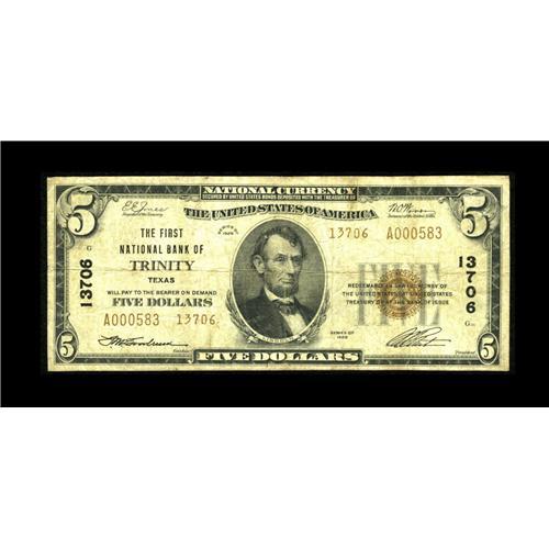 <B>Trinity, TX</B></I> - $5 1929 Ty. 2 <B>First NB</B></I> Ch. # 13706<BR>This <B>Fine</B></I> note passed through an auction held at the ANA convention in August of 2004, where it sold for $460. It should certainly do at least as well tonight. Although two federally chartered issuers were located here, this was the only bank to emit the $5 Type 2.<BR><BR><b>Shipping:</b> Coin/Currency (<a target="_blank" href="http://www.heritageauctions.com/common/shipping.php">view shipping information</a>)