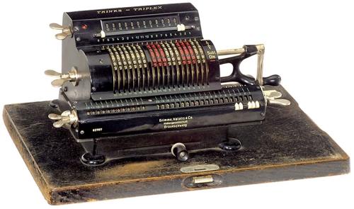 Trinks-Brunsviga Triplex Selteneres Modell mit speziellem Einstell-Anzeigewerk. Mit Blechhaube. – Ein exzellentes Exponat und Sammlungsstück. Rare model with special setting show display – (3/2) – € 350/450 – (341/5)