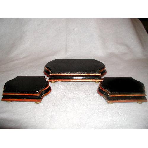 Trio of Italian stands or pedestals were hand made by Karl Man mid 19th century. The black and gilt scrolled set are scribed on the top with a lattice work design,surrounded by a 1/2 inch solid border.One solid piece of wood 1 3/4 inch thick was used for the larger,1 1/4 smaller. Signed on the bottom in pencil obviously as a present to "Elizabeth Karl Man" and incised on each with "DS" in an oval. The set was probably designed as a stand or base to accent an antique Italian or French clock and two cassolettes or candle holders. The larger is flat on one side to fit against the wall. Wonderful under so many items as a set or individually. Stand on gilt bun feet. In wonderful condition. Large base measures 10.75L X 7.25D X 2H,smaller 6 3/8L X 4.75D X 1.75H.