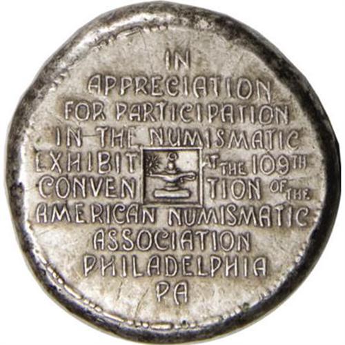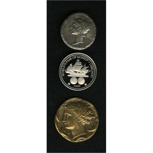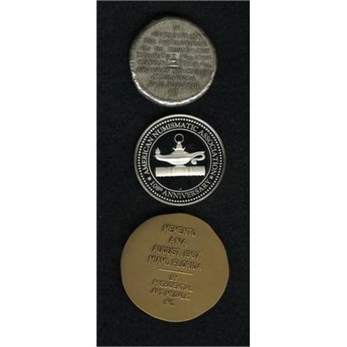 <B>Trio of ANA Medals.</B></I> Includes three medals issued by the American Numismatic Association: one issued in <B>1999 for the 108th convention, </B></I>struck in proof sterling silver; a presentation piece in appreciation for participation in the numismatic exhibit at the <B>109th ANA convention in Philadelphia, "</B></I>Mercury" Head obverse, dated 2000 and a <B>bronze memento of the 1967 ANA convention </B></I>in Miami, serial number 74.<BR><BR><b>Shipping:</b> Coins & Currency (<a target="_blank" href="http://www.heritageauctions.com/common/shipping.php">view shipping information</a>)