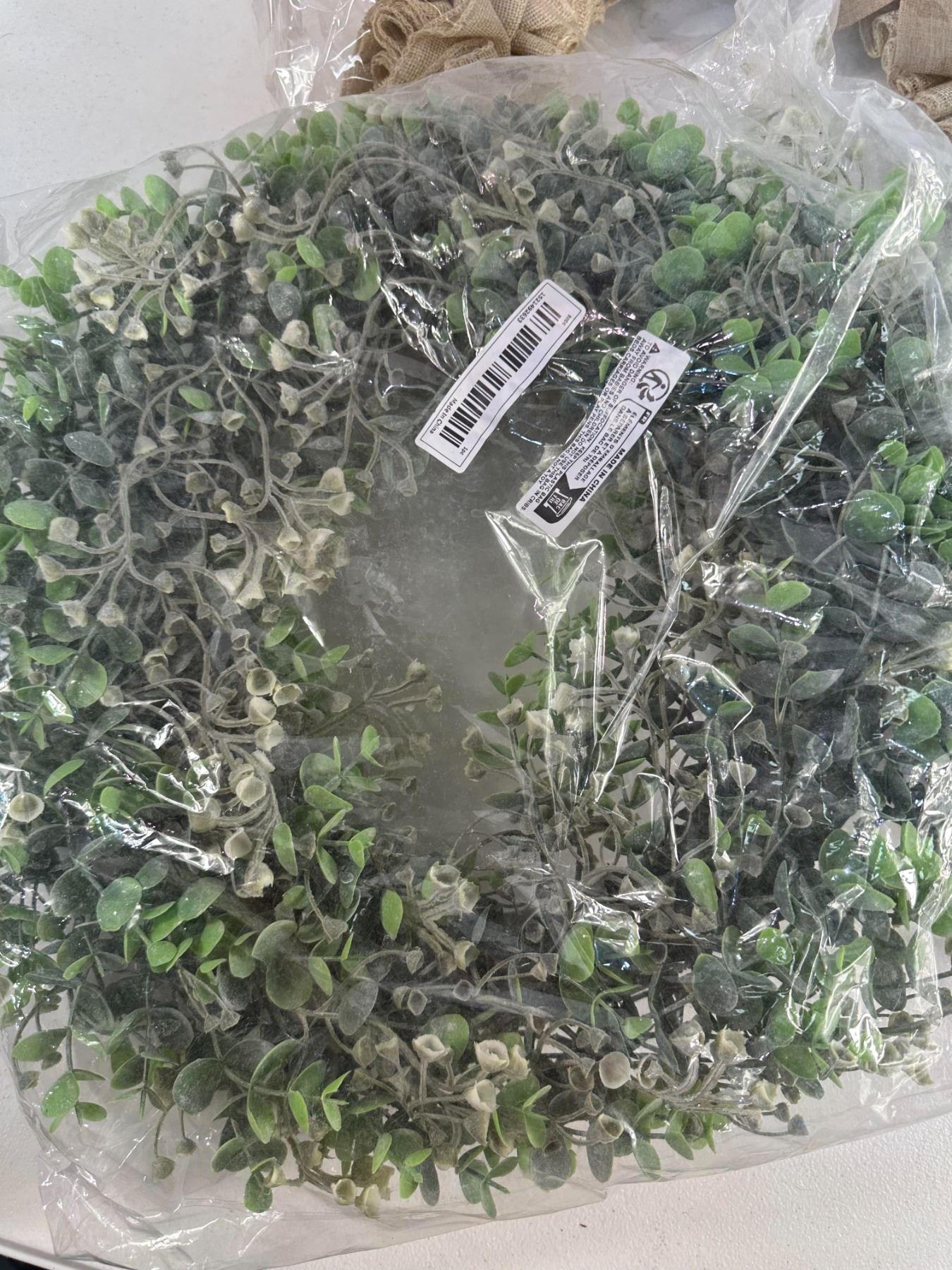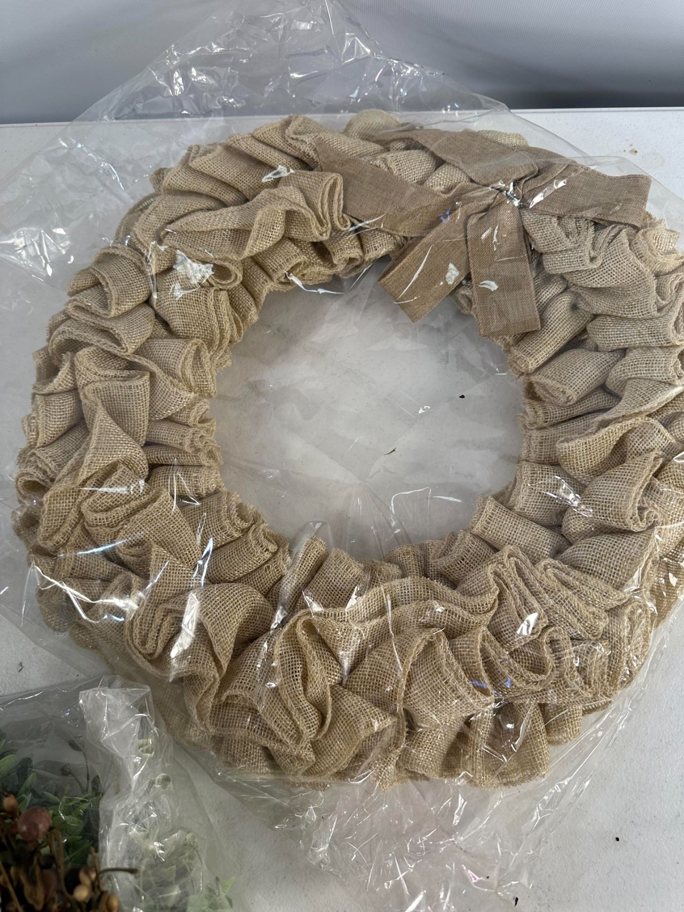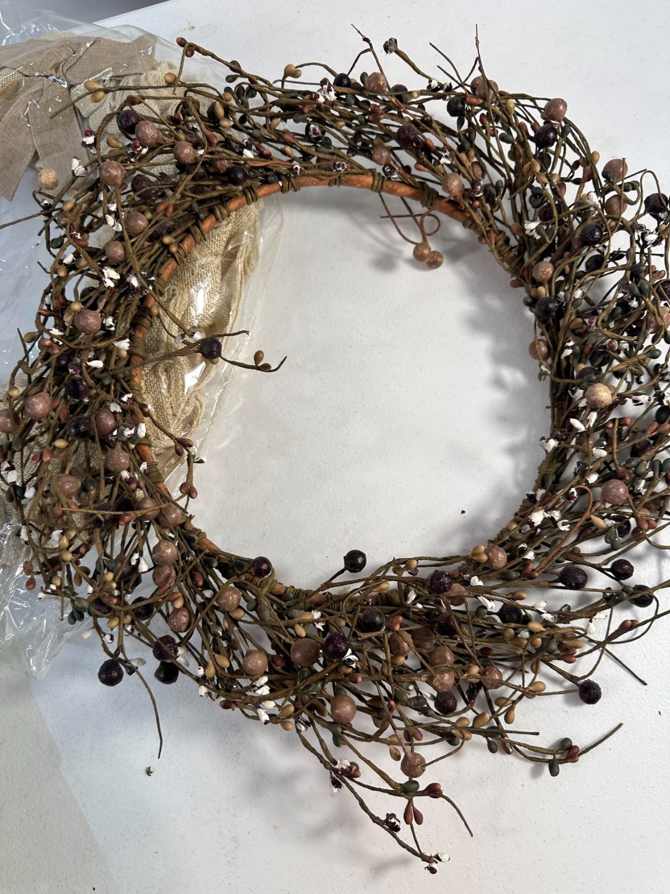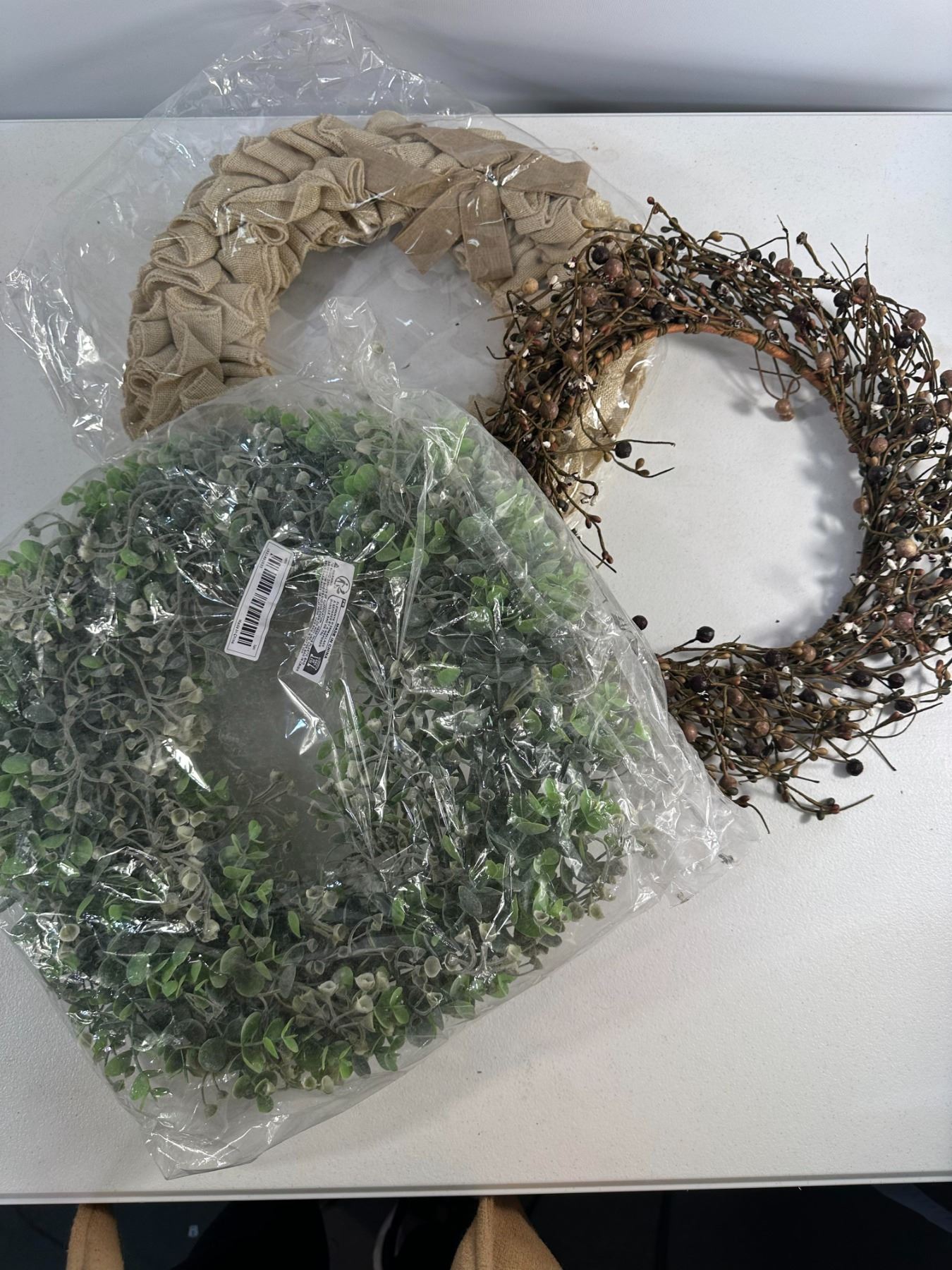 Set of three charming decorative wreaths including a faux greenery wreath, a rustic twig and berry wreath, and a burlap ribbon wreath. Suitable for year-round or seasonal décor. Mix of natural and fabric materials. Good overall condition, some light storage wear.