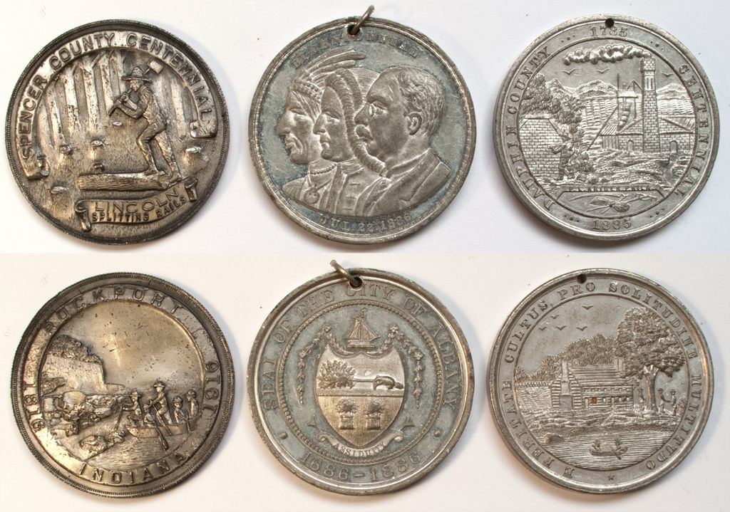 Lot of 3: 1) obv.: Dauphin County Centennial / 1785-1885 / P.L. Krider Phila; Rev.: E Feritate Cultus Pro Solitudine Multitudo; aluminum, 38mm, holed, XF-AU; 2) Obv.: Bi-Centennial Jul. 22, 1886; Rev.: Seal of the City of Albany 1686-1886; Aluminum, 38mm hole, XF-AU; 3) Obv.: Spencer County Centennial / Lincoln Splitting Rails; Rev.: 1816-1916 Rockport Indiana; white medal, 38mm, VF-XF.