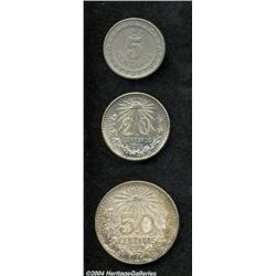 <B>Trio of Minors,</B></I> KM421 5 Centavos 1912 VF; KM435 20 Centavos 1908 VF; KM446 50 Centavos 1919 XF. 3 coins <BR><BR><B>Important notice:</B> Heritage usually auctions material at the rate of 200-250 lots per hour. On some occasions eBay Live bid software or the Internet may not be able to keep up with the pace of the auction. We recommend placing a realistic absentee bid now as insurance to avoid disappointment. Occasionally the auctioneer may eliminate or reject an eBay Live bid, and the auctioneer may also reopen a lot after the close of the eBay live bidding (usually because we missed an audience bid), and may reject your bid even if it shows you as the winning bidder. By bidding via eBay Live, you agree that Heritage may award the lot to another bidder at its sole discretion under the circumstances described above or any other reasonable circumstances. Since eBay bids are not shown to us until we open the lot on the floor, we treat those bids just like floor bids. In most cases the floor responds before the eBay bid is presented to us, due to Internet lag time, so for consistency we have made it a policy that floor bids are always considered first over tie eBay live bids. Also please note that all Heritage lots purchased through eBay Live carry a 20% Buyer's Premium. Please make sure you read the Terms and Conditions before you bid.