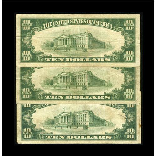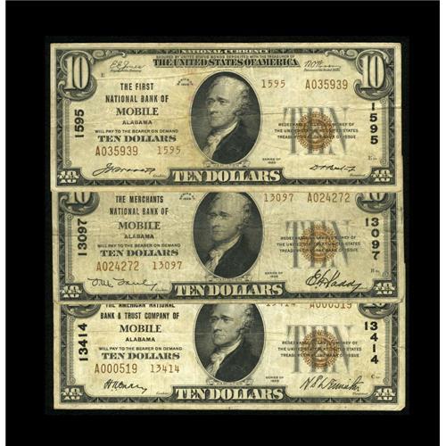 <B>Trio of Mobile Type Two Tens<BR>Mobile, AL </B></I>- $10 Ty. 2 <B>FNB</B></I> Ch. # 1595 <B>Fine-VF,</B></I> Ink stamp on face<BR><B>Mobile, AL</B></I> - $10 Ty. 2 <B>Merchants NB</B></I> Ch. # 13097 <B>Fine</B></I><BR><B>Mobile, AL</B></I> - $10 Ty. 2 <B>American NB&TC</B></I> Ch. # 13414 <B>VF</B></I>.