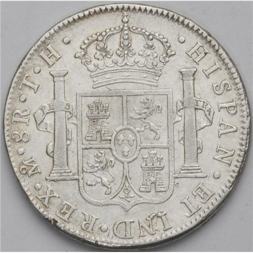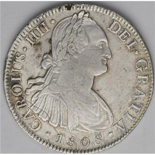 <B>Trio of Spanish Colonial Carlos IV Bust 8 Reales, </B></I>Bolivia 1807-PJ, XF-AU, small surface marks, Mexico 1808-TH, VF-XF, unusual obverse scratch or strike-through, and Peru 1808-JP, XF-AU with minor surface oxidation. <B>Sold as is, no return lot.</B></I>