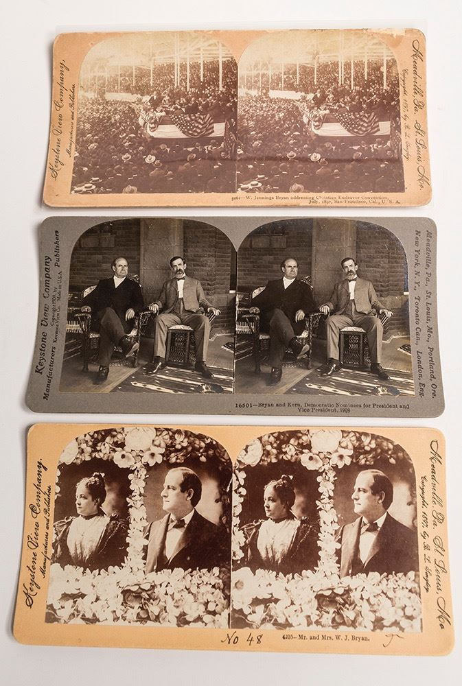 Three different Bryan stereoviews. 1) Two c.1897 Keystone cards: # 5061 showing Bryan addressing the Christian Endeavor Convention in San Francisco and rare # 42052 showing portraits of Mr. and Mrs. Bryan. 2) Keystone c.1908 card # 16501 showing Bryan and Kern, Democratic nominees for President and Vice President. Bryan was the Democratic presidential nominee three times, losing to McKinley in 1896 and 1900, and then Taft in 1908. He "invented" the idea of political candidates doing "stump" tours. He believed in bimetallism, arguing against the Gold Standard. He was also an opponent of Darwinism and argued for the prosecution in the famous Scopes Trial. (Prag Collection) Date: Location: United States HWAC # 54710