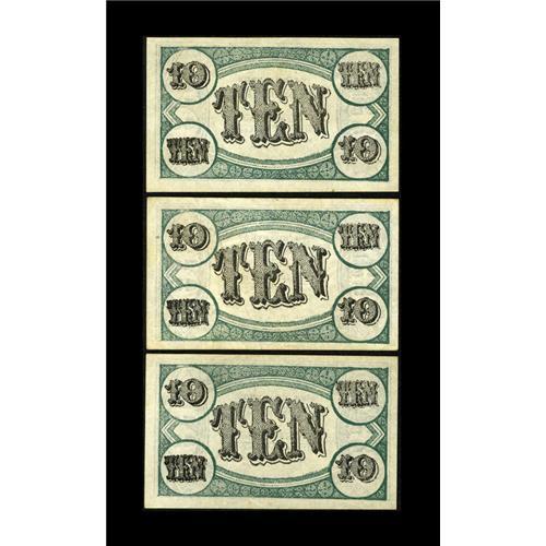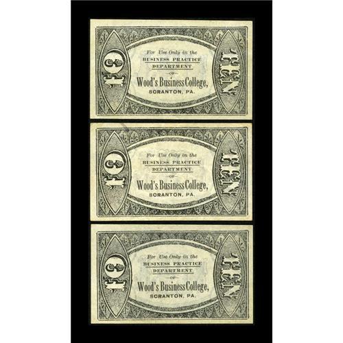 <B>Trio of Wood's Business College 10¢ Notes.</B></I><BR> Unlisted in the Schingoethe reference, two notes grade <B>CU</B></I>, with the remaining note <B>VF</B></I>.<BR><BR><b>Shipping:</b> Coins & Currency (<a target="_blank" href="http://www.heritageauctions.com/common/shipping.php">view shipping information</a>)