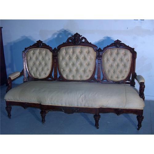 </font></strong>Renaissance Revival Triple Medallion Back Settee - Heavily carved walnut and burled walnut settee. Woman's Head Carved in Medallions on Settee back and arms of settee. Great detail. Settee in very good condition, material somewhat worn. 48"h x 78"w x 24.5"d</font>