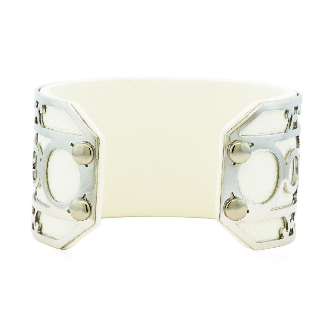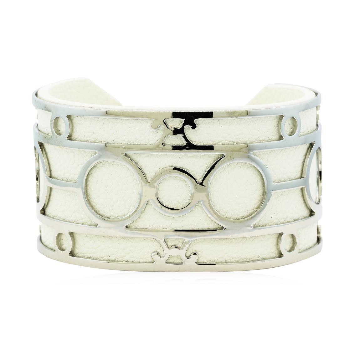 High end designer jewelry. Triple Circle Design Cuff Bracelet - Metal and Leather. Metal& Leather Bracelet. White/ Silver. One Size.