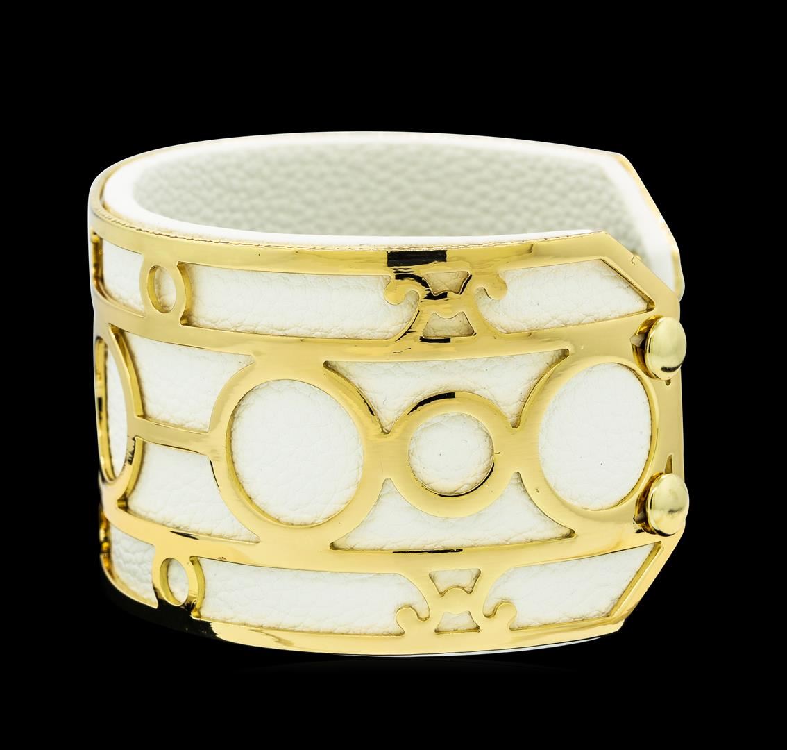 High end designer jewelry. Triple Circle Design Cuff Bracelet - Metal and Leather. Metal& Leather Bracelet. White/gold. One Size.