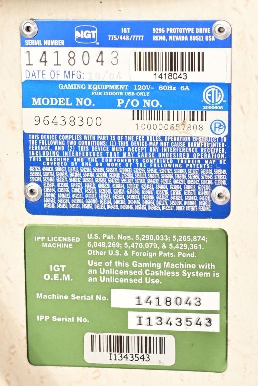 Turns on & lights up, does need some work. Nevada gaming stamp on side. Manufactured 2004 by IGT. 21" x 26" x 52"