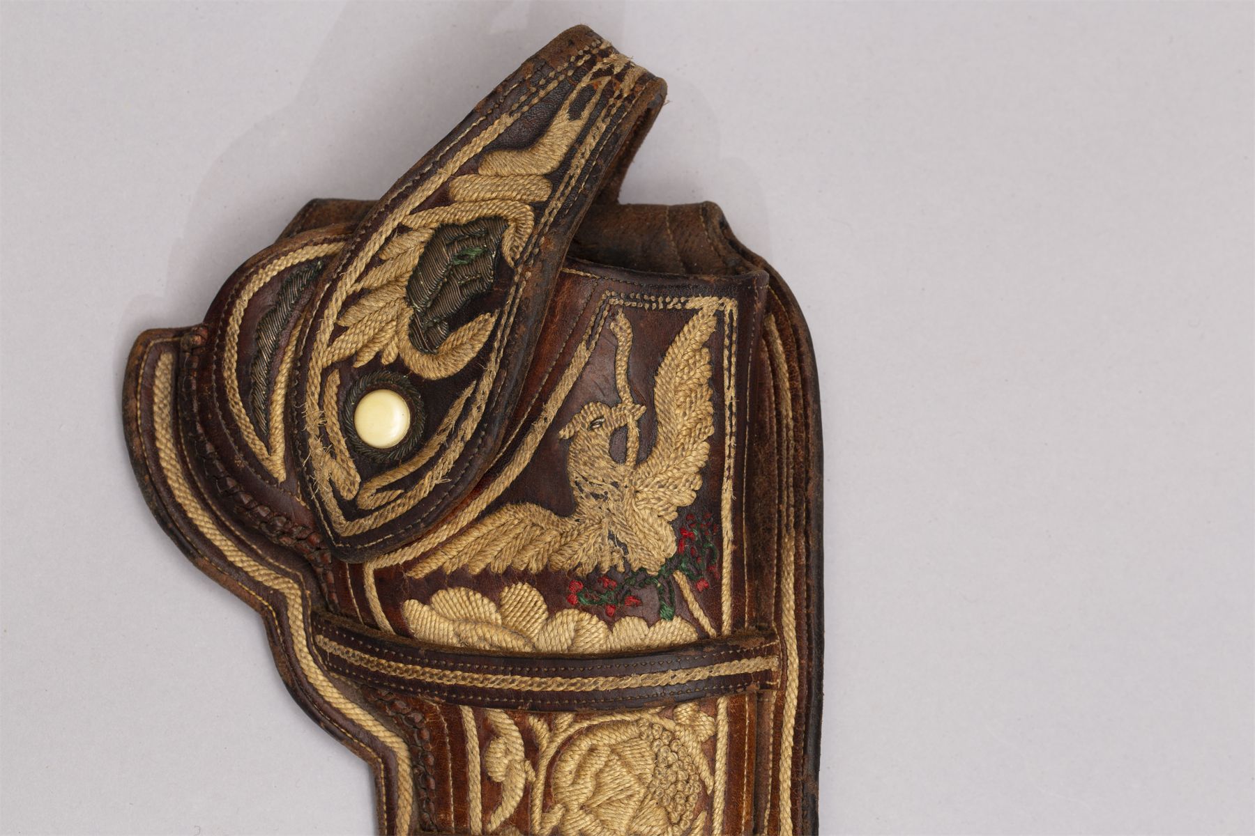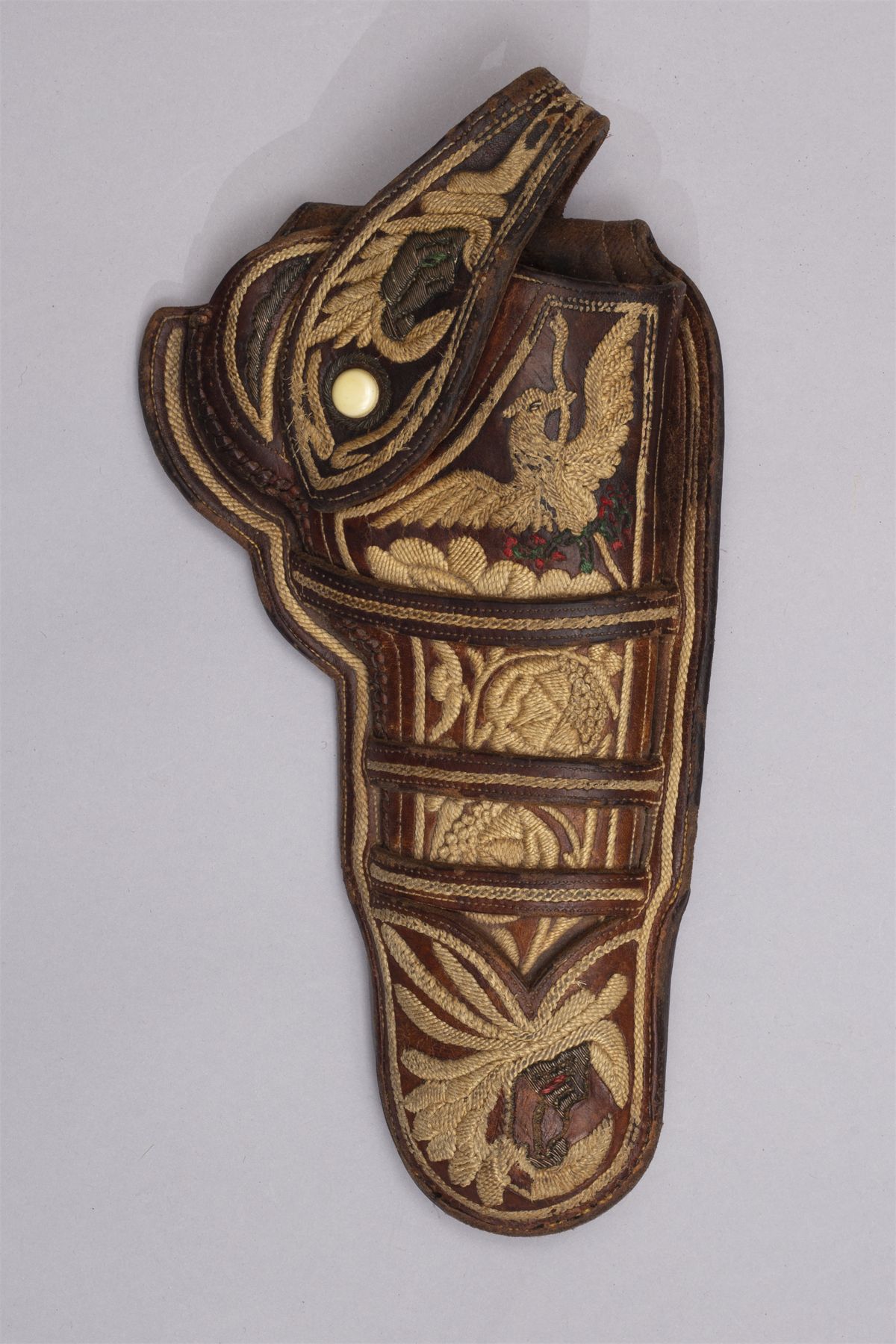 Triple Loop Mexican Holster with nice Piteado work of an eagle & snake with silver thread highlights. Fits 5 1/2" Colt S.A.A