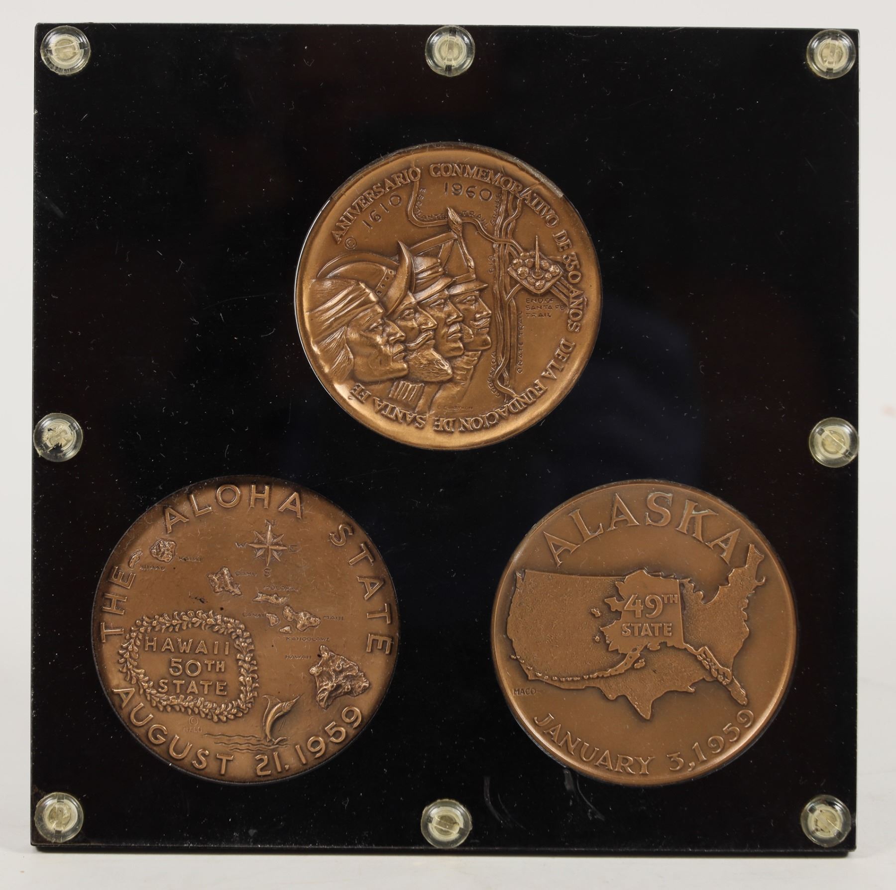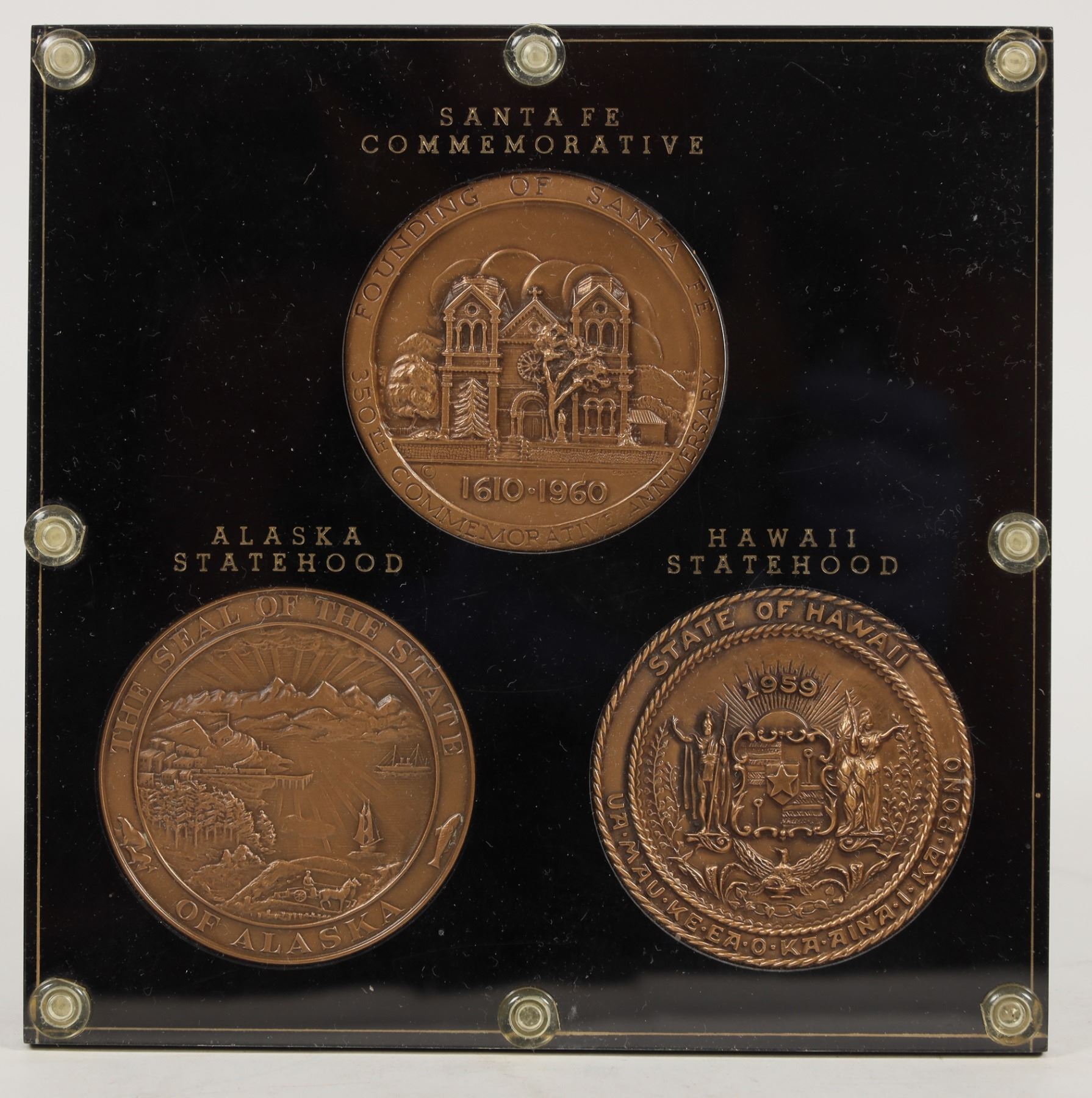 (3) High-relief medallic arts medal set, approx. 62 mm each. Mounted in black Capitol plastics holder with gold trim. Medals are as follows: (1) 1960 Founding of Santa Fe/ 350th Commemorative Anniversary/ Annversario Commemorativo De 350 Anos De La Fundacion De Santa Fe. (2) The Seal of the State of Alaska/ Alaska 49th State/ January 1959. (3) MAU KE EA O KA AINA I KA PONO State of Hawaii/ UA/ The Aloha State/ August 21. 1959 (NIIH-IAU Spelling) All (3) medals are in Gem BU condition.