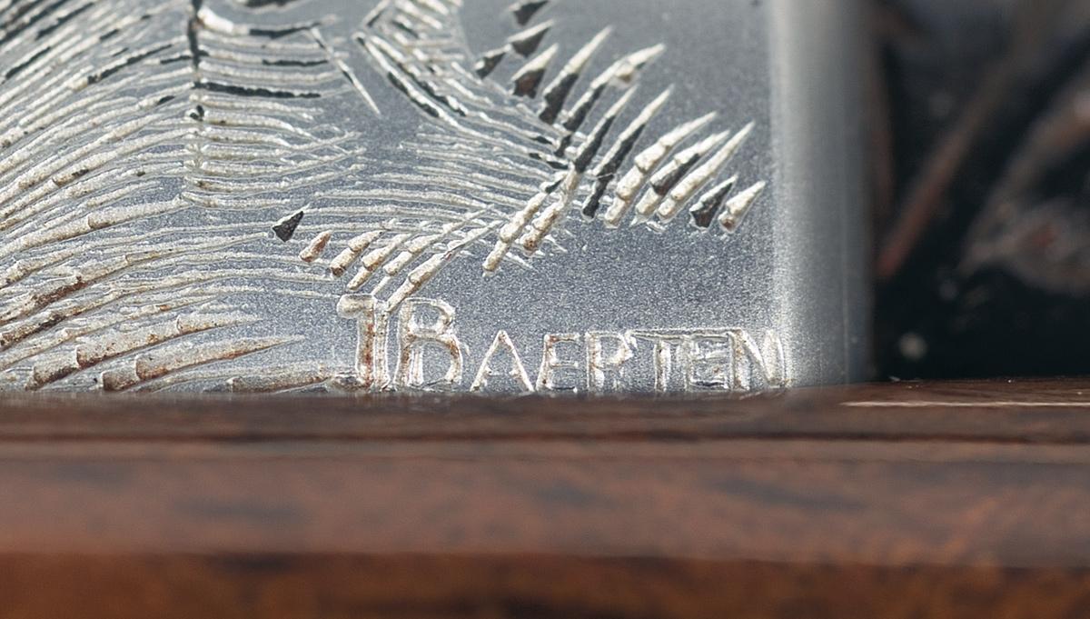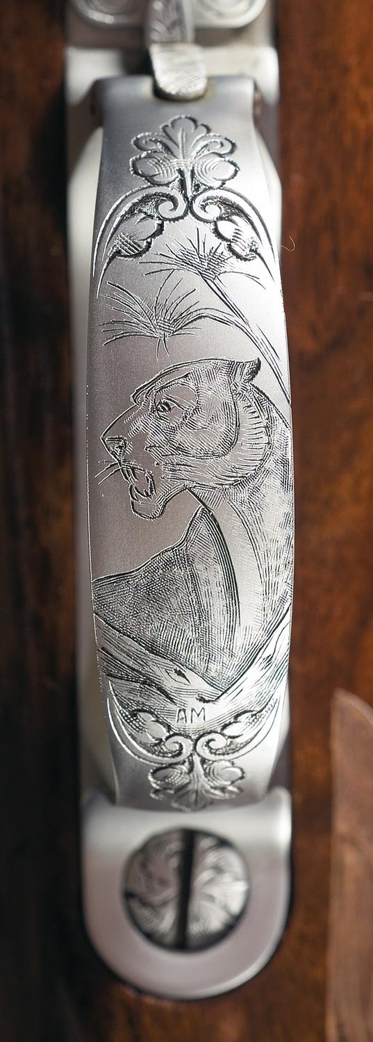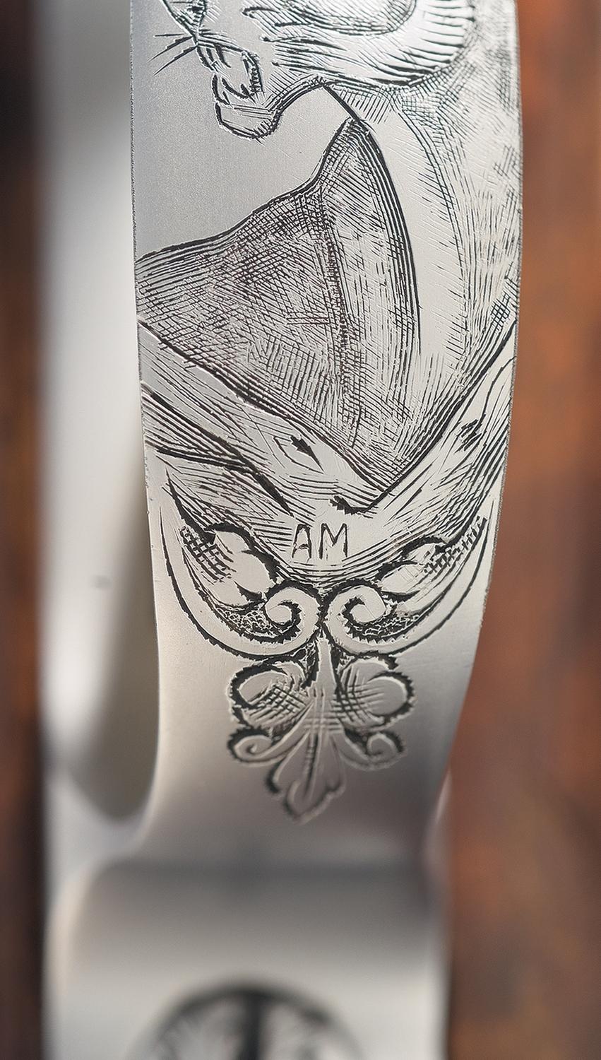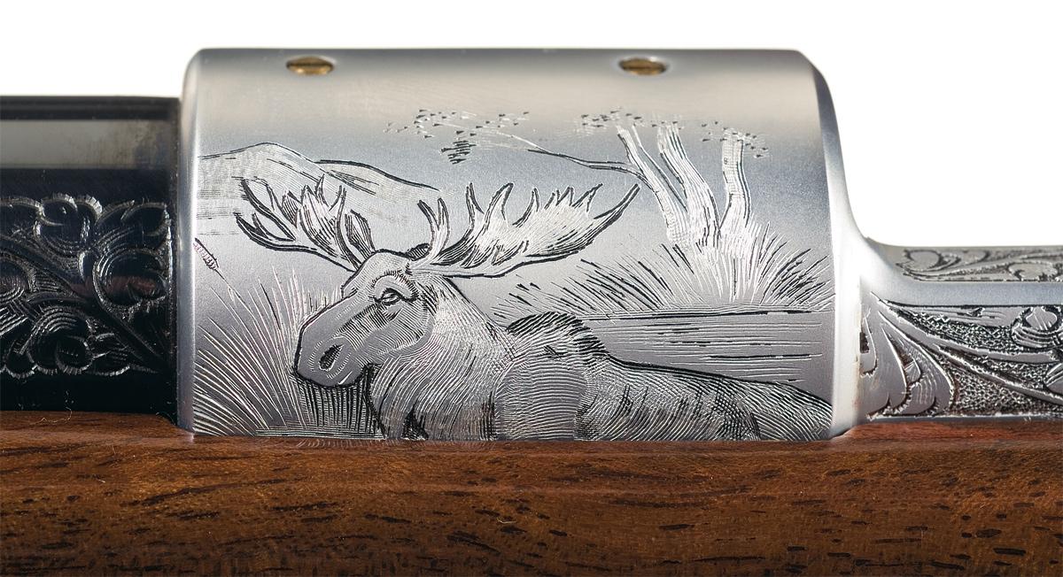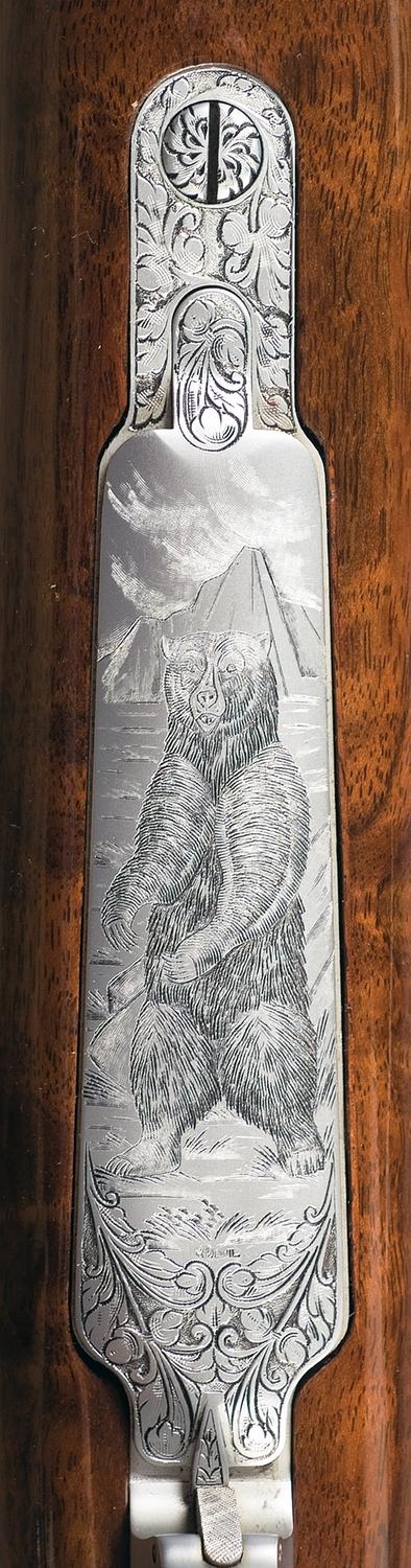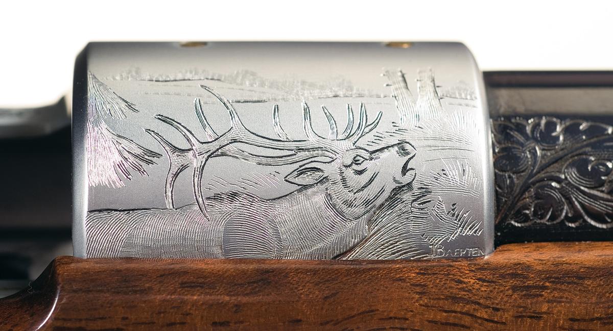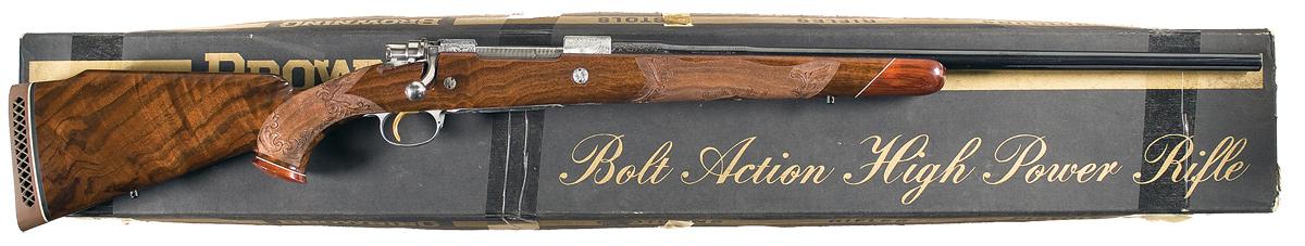 Manufactured in 1968 in Belgium, this rifle features a blue barrel manufactured without sights and French grey finish on the remaining parts. The top of the receiver has been factory drilled and tapped for scope mounting. The follower and bolt are polished with a jeweled extractor, and the trigger is gold washed. The front receiver ring is engraved with a moose on left side and a bugling elk on the right side, and the remainder of the action is scroll leaf and punch dot engraved. The right side of the receiver is signed "J BAERTEN". The hinged floor plate engraved with a standing bear in a mountain scene with floral scroll engraving below and on the attaching metal and signed "R DEWIL" on the floor plate. The trigger guard is engraved with a mountain lions head and signed "AM" most likely A. Marechal. There is a two inch wedge of floral scroll engraving on each side of the breech end of the barrel. The screw heads and stock bolts are also engraved. The stock is extra fancy select walnut with a high gloss finish, fine line checkering and floral and punch dot hand carving on the forearm and grip area, contrasting forend and grip cap with a diamond shaped brass inset on the grip cap, raised comb, cheekpiece, rubber vented Browning recoil pad and sling swivel studs. Complete with a two piece black and gold Browning box.