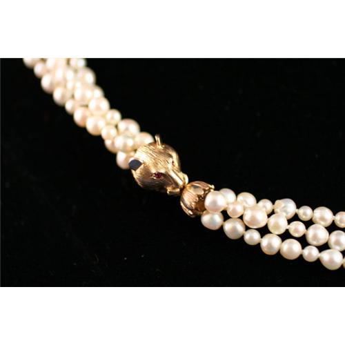 Fabulous fun and wearable! This triple strand of cream colored freshwater pearls is 18.5 inches long. They range in size from 2mm-5mm and are individually knotted. The clasp is a lion's head of 14K yellow gold with shining ruby eyes.