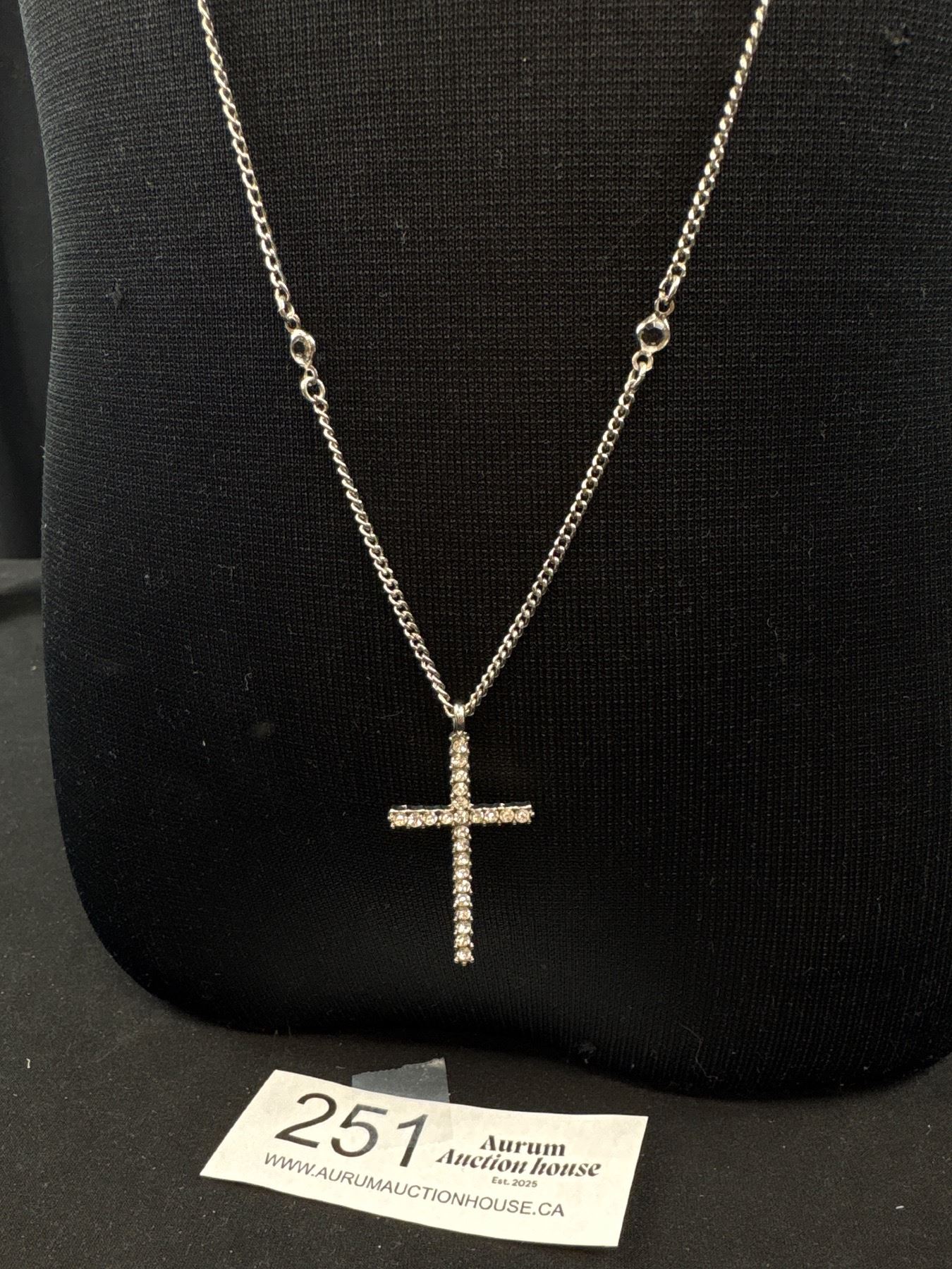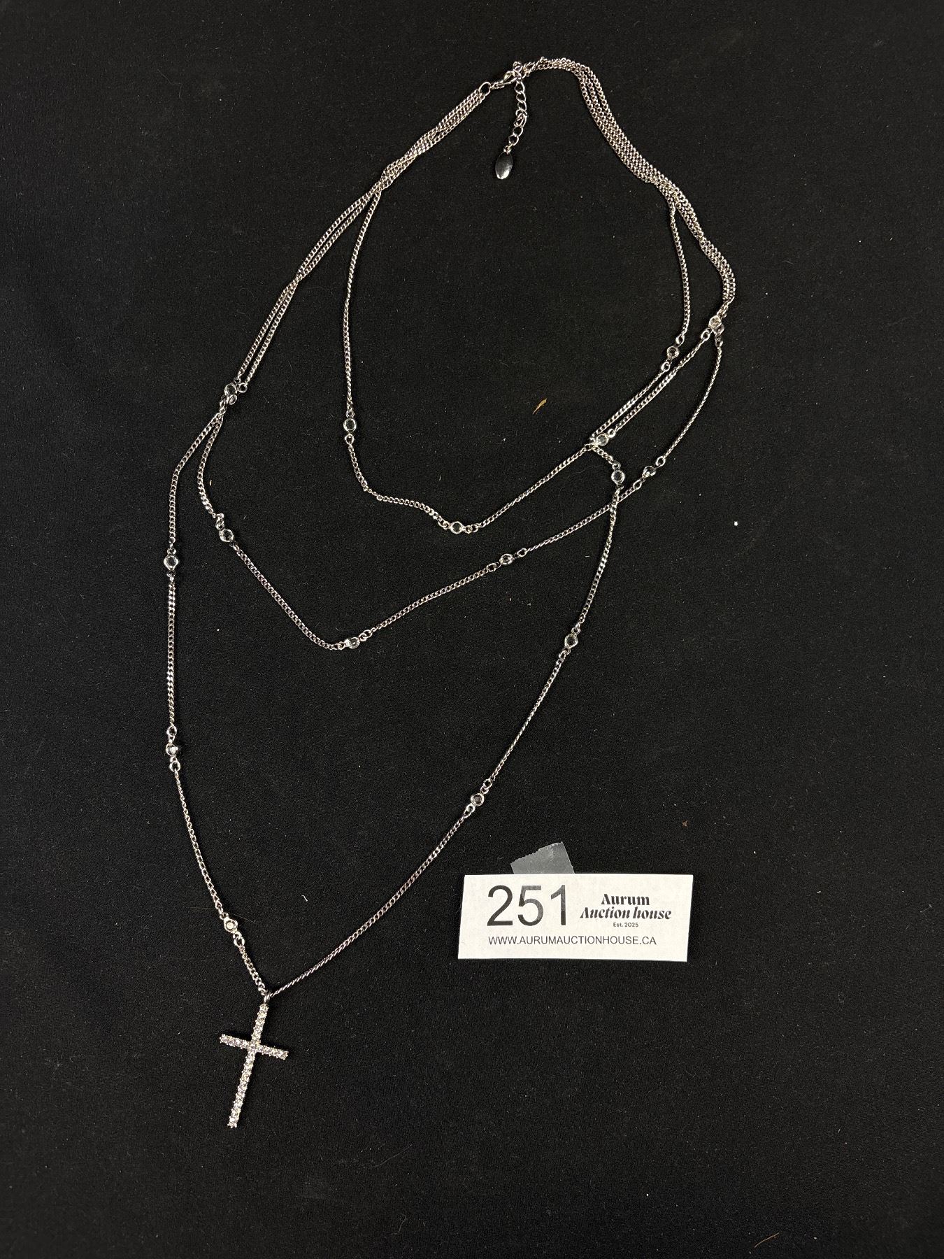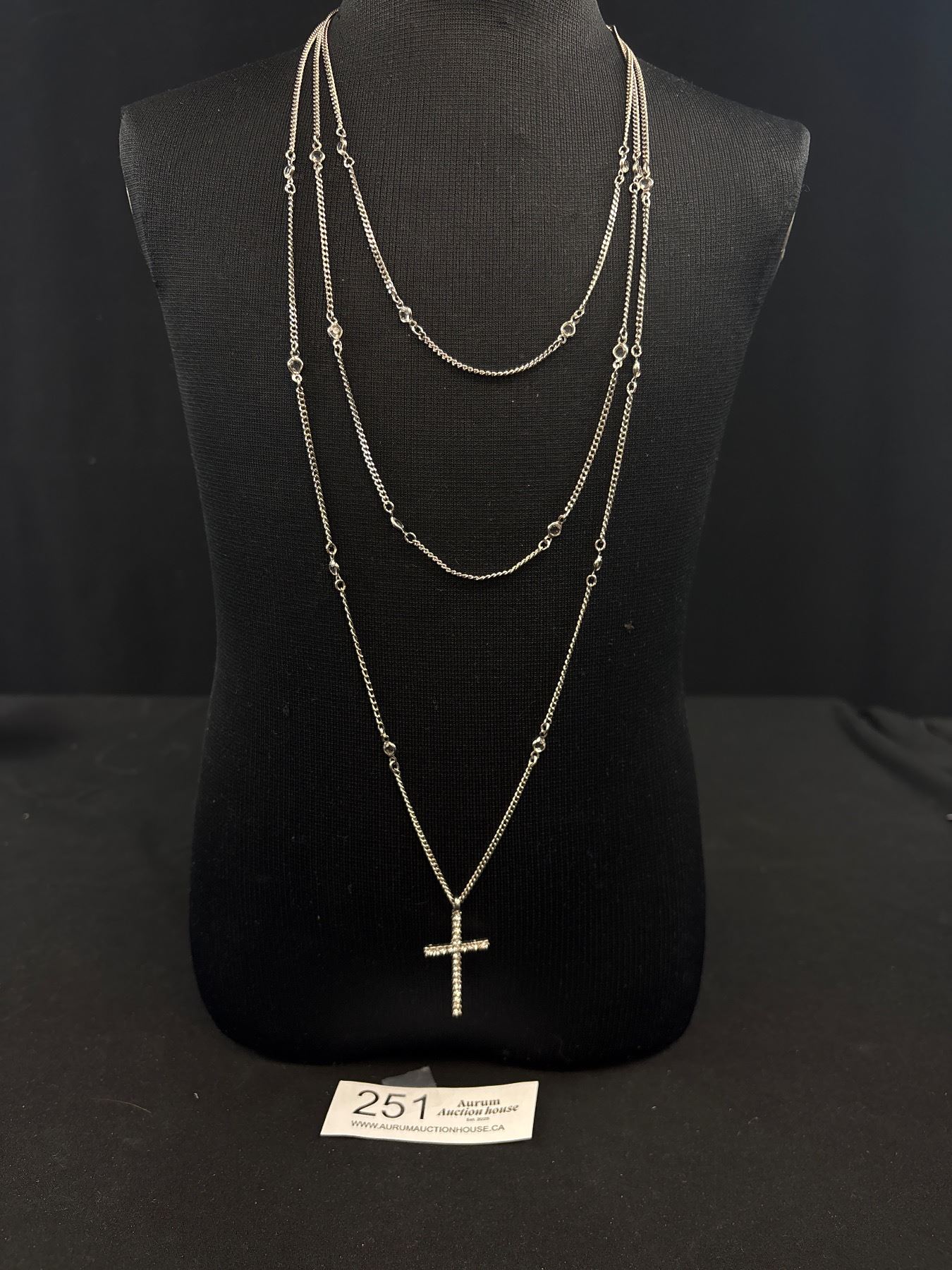 Triple Strand Silver Necklace w/ Rhinestones Cross Pendant