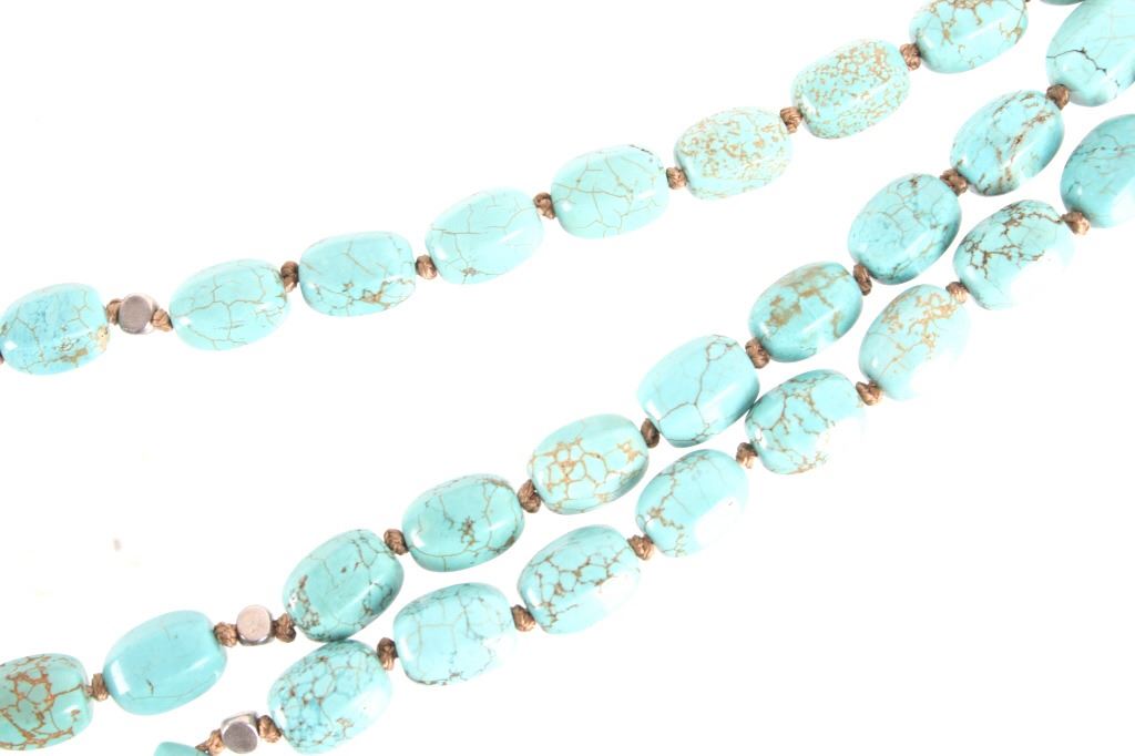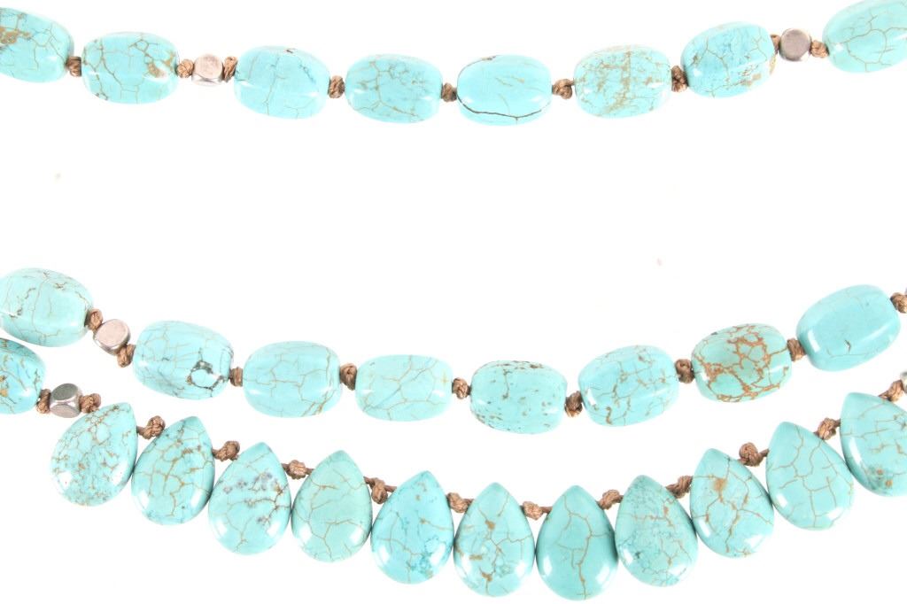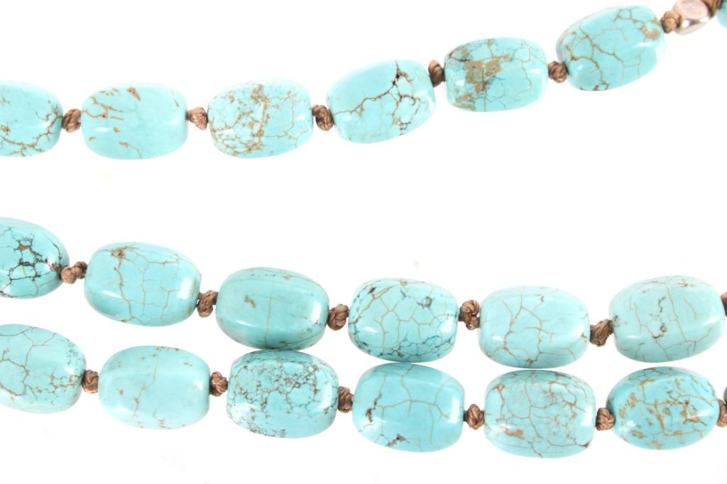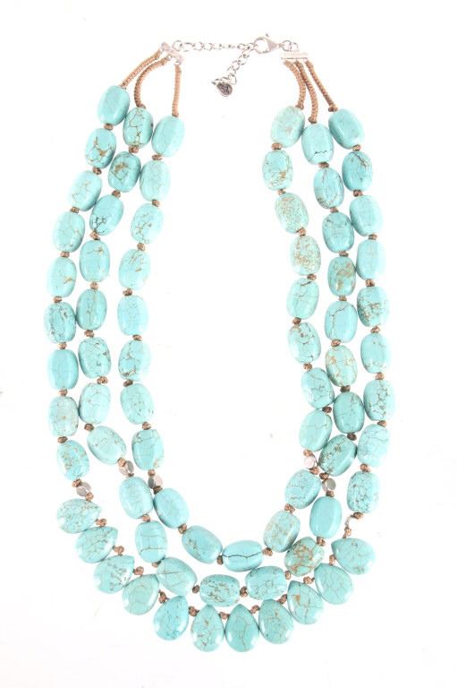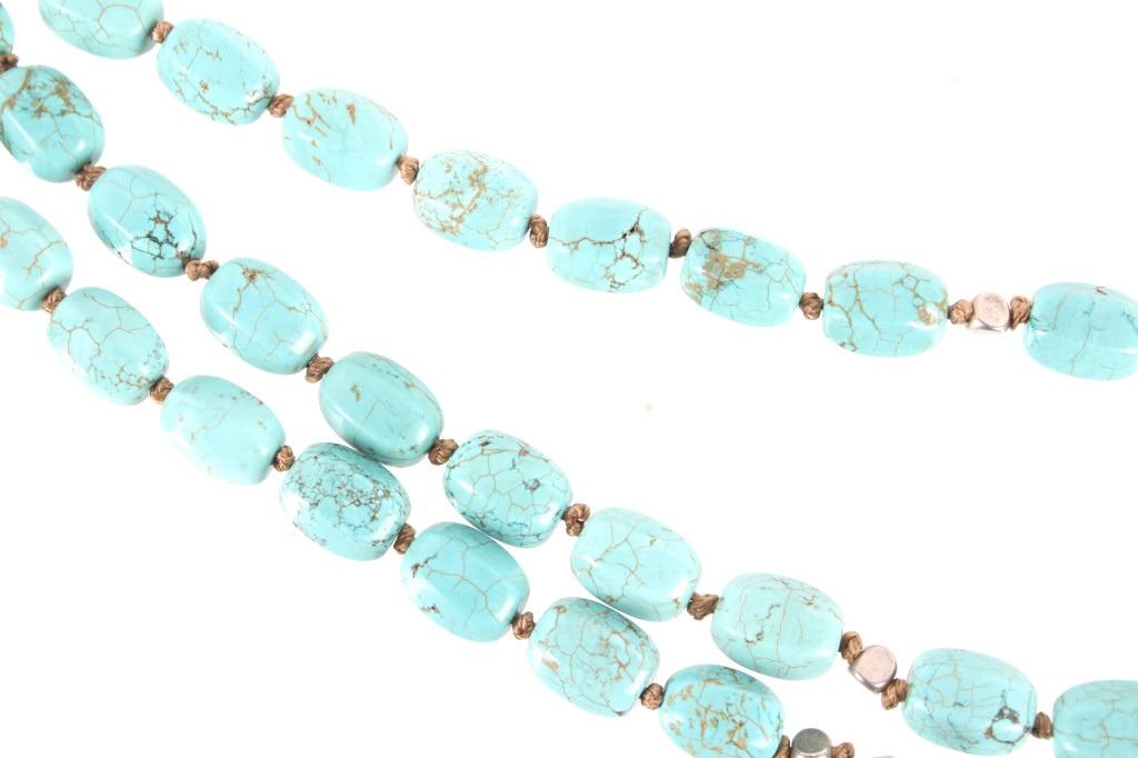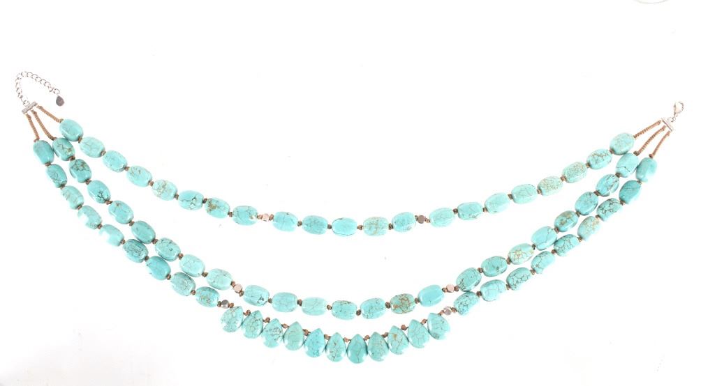 This lot includes a Navajo Triple Strand Turquoise Sterling Silver Necklace, 925 and artist hallmark stamped. Barrel shaped turquoise stones make up the majority of the necklace with eleven (11) tear drop shaped stones adorning the bottom of the longest strand. The beautiful stones have a spiderweb type matrix of mostly brown, but also some black and blue, and are strung on sturdy Navajo cord that is knotted and braided to form a soft comfortable neck piece. Native Americans associate turquoise with the blue sky and the green earth. It is known as the ’Traveler’s Stone’ and is prized by those who travel by land. They believed that wearing turquoise resulted in happiness and security. Is said to possess healing and protective powers, attracts luck, love, and money. Turquoise helps to ground the spirit while keeping its connection to the infinite open. Turquoise allows the energy path to remain clear. In fact, many First Nation people hold the belief that by wearing turquoise the human mind becomes one with the universe. Sterling stamp 925 on lobster claw clasp, artist hallmark stamp located on chain link medallion at clasp. This turquoise necklace is in good overall condition, patina exhibited on Sterling portions, no obvious marring noted. Stones measure approximately 1/2" to 3/4" in length each, total length of necklace is 10.5"L