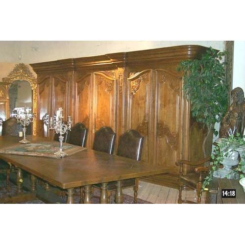 This massive and beautiful French armoire is fit for a King. It measures 15 1/2 feet long and has 6 doors. We acquired it in France and believe it to be about 50-60 years of age. The armoire disassembles completely for moving. The sheer size and beauty of this armoire make it a stand out piece.