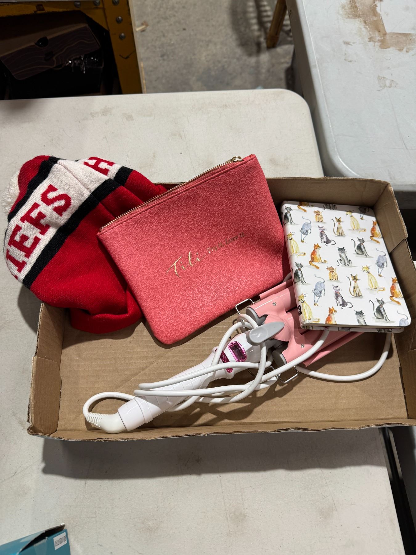 Triple barrel, curling, iron notebook, and make up bag and hat