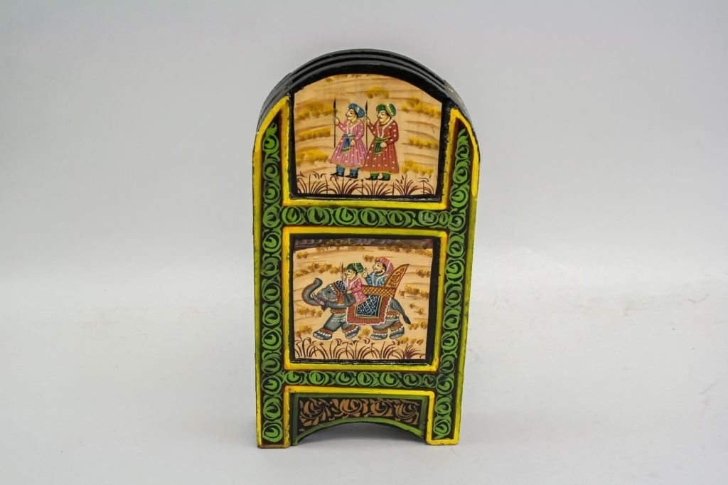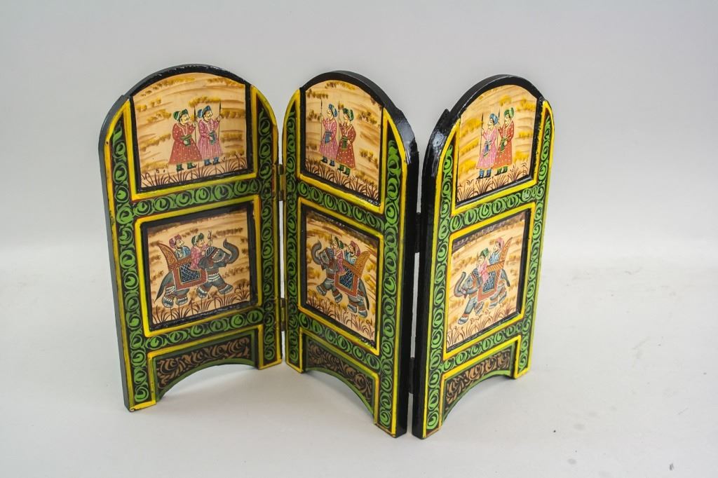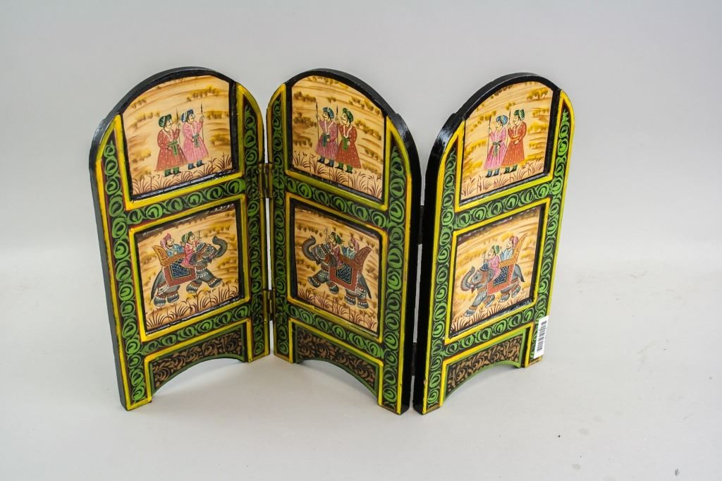 Hand-painted mini wooden table screen. Painted with two figures riding an elephant. 29 x 15 cm, 1007 grams.