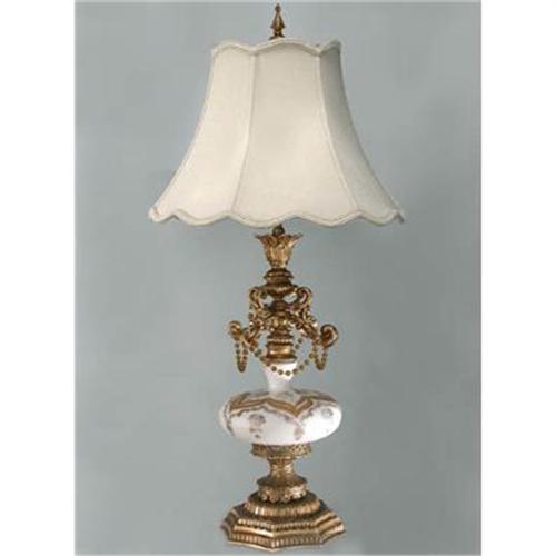 Height: 34" Width: 18" Bulb: 50-100-150 3-Way Imported Bavarian triplex glass hand decorated with 24k gold and icing. Amber color crystal beads complete the look. Handsewn scallopped silk shade. Available Finishes Antique Gold Click to Enlarge <BR>Free Shipping in the continental US