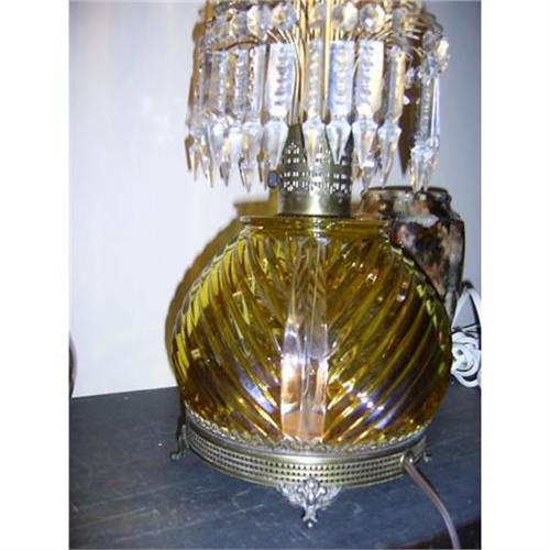 An antique cut amber glass lamp with tripple tiers of glass prisms. This lamp works fine and the base lights up along with the top or alone for a night light. REDUCED RESERVE
