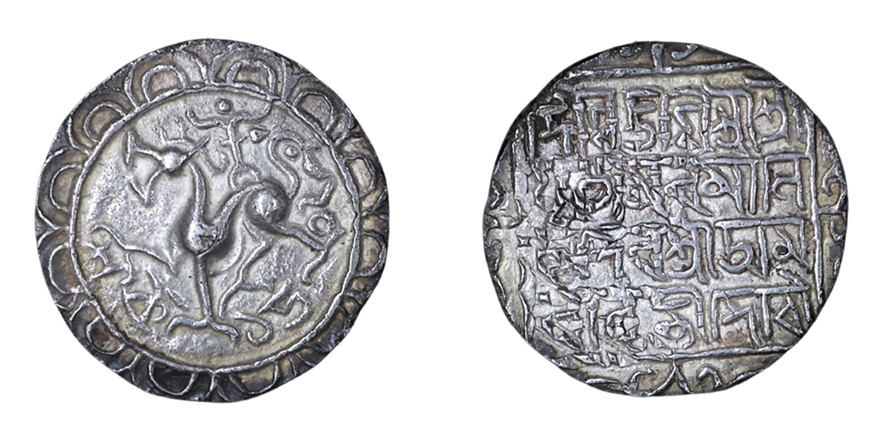 Amara Manikya (SE 1499-1508 / 1577-1586 AD), Silver Tanka, Saka 1502, with title 'Conquerer of the World,' citing Queen Amaravati, 10.48g, 23.57mm Obv: Lion Facing Left, dated below Saka 1502. Rev: “Digbijayi Sri Sri/ Yatamara Mani/kya deva Sri Ama/ravati Devyauâ€. (RB#166, KM#91), Extremely Fine, Scarce.It is the second coin of Amar Manikya. After the victory over “Bholua†and “Baklaâ€, Amar Manikya introduced this coin. As he conquered all region in all direction of Tripura kingdom, so he thought that he had able to establish larger Tripura Kingdom. Here in the first line “দিগà§à¦¬à¦¿à¦œà¦¯à¦¼à§€â€ (Digbijayi) means “conquer in all directionâ€. Though Later he conquered Srihatta now known as Sylhet in Bangladesh.