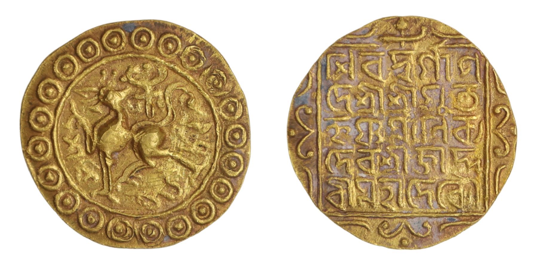 Krishna Manikya (SE 1682-1683 & amp; 1689-1605 / 1760-1761 & amp; 1767-1783 AD),Gold Mohur, dated Sk.1582 in error for Sk.1682, 10.62g, 25.93mm, Obv: Lion facing left, standard above, date below and to the right saka 1582, within circle and border of beaded annulets, Rev: “Siva Durga Pa/de Sri Sri Yuta/ Krishna Manikya/ Deva Sri Jahna/vi MahaDevyauâ€, in square with ornamented border, (RB# 250; KM. 234), Extremly Fine, Extremely Rare.After ruling for a couple of years, Indra Manikya was overthrown and replaced, in around 1746, by Vijaya Manikya II, of whom no coins are known. Tripura soon came under the domination of a Muslim rebel, Shamsher Ghazi who having made himself ruler of the plains area of Tripura, proceeded to plunder Udaipur, the capital, and then declare himself ruler of the whole state. As the people refused to acknowledge him as king, he installed Lakshmana Manikya as a puppet ruler, but afterwards apparently ruled in his own name until captured by the Nawab of Murshidabad and executed. This allowed the return of the Tripura royal family in the form of Krishna Manikya who had taken refuge in Kachar. However, the Nawab came under the control of the British, so when a revenue dispute was referred to him around 1761, the British decided use this excuse to annex Tripura. After this, control remained nominally in the hands of the Nawab who placed Balaram Manikya on the throne. He must have been ineffectual as the situation in the hills, where the capital was, remained confused, until Krishna managed to regain the throne in 1767, with the help of the British Governor of Bengal.
