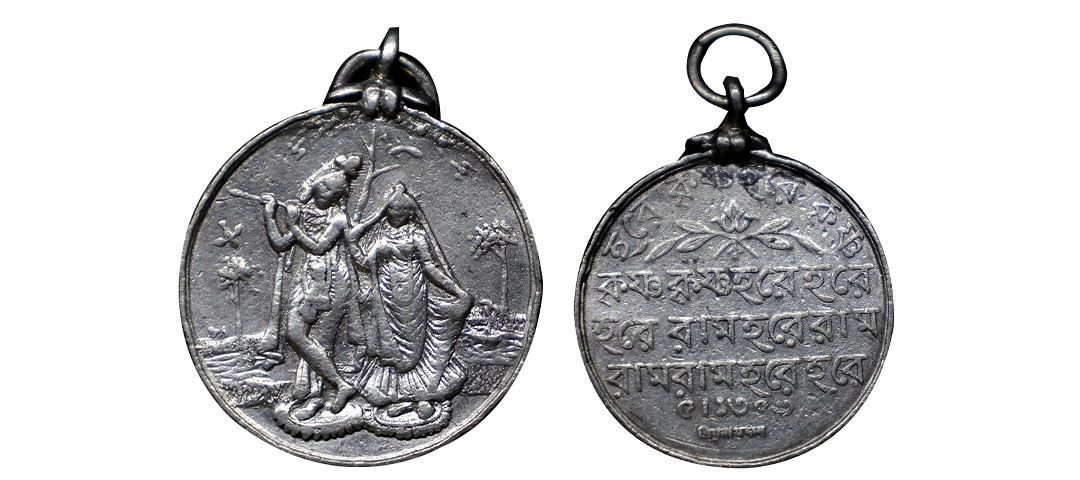 Tripura, Silver Medal, obv. Radha Krishna standing under a canopy of a tree with a peacock above with flora and fauna in the background, rev: legend Hare Ram Hare Krishna (Indian Medals, Tokens, Pictorial Plaques & Pendants 1800 to 2010, Mitchiner 157). Very Fine+, Rare.