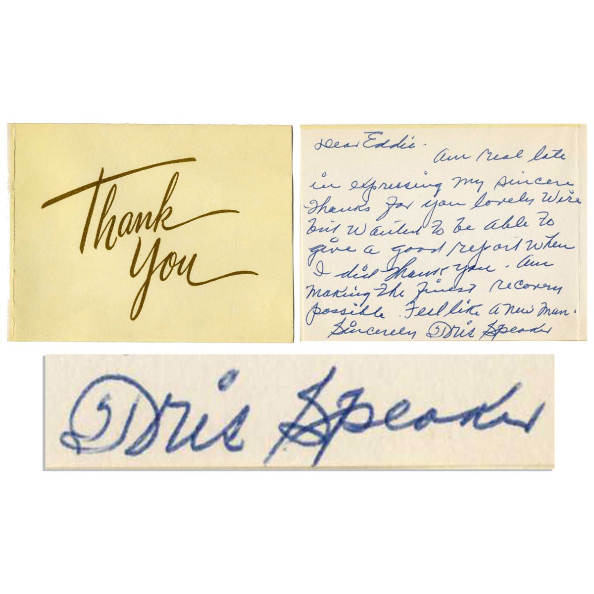 Undated thank you note signed by Tris Speaker. Writing to fellow MLB player Eddie Robinson, Speaker thanks him for his ''...lovely wire...'' and reports that he is ''...making the finest recovery possible. Feel like a new man. / Sincerely Tris Speaker''. Blue ink signature is clear. 4.25'' x 3.25'' card style note is in near fine condition.