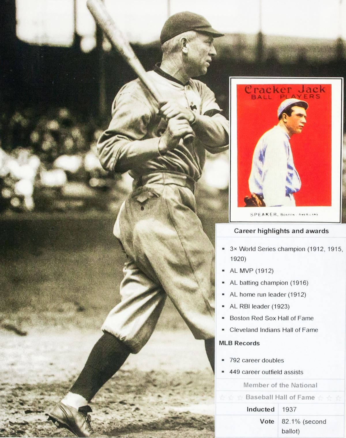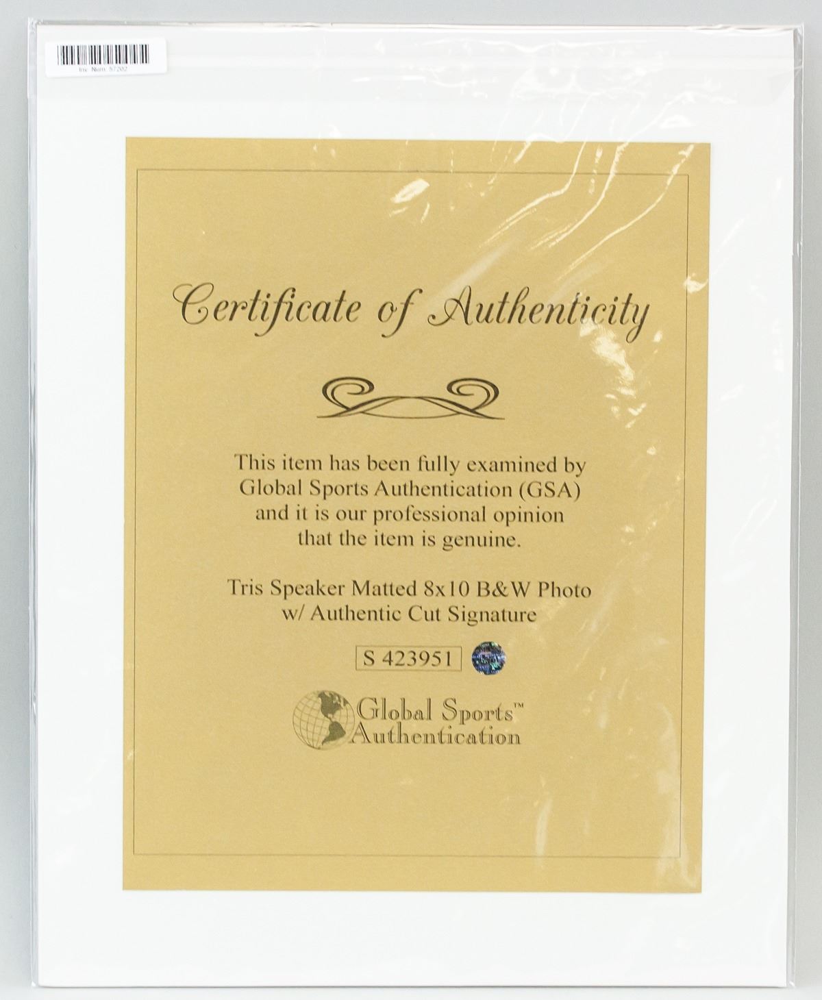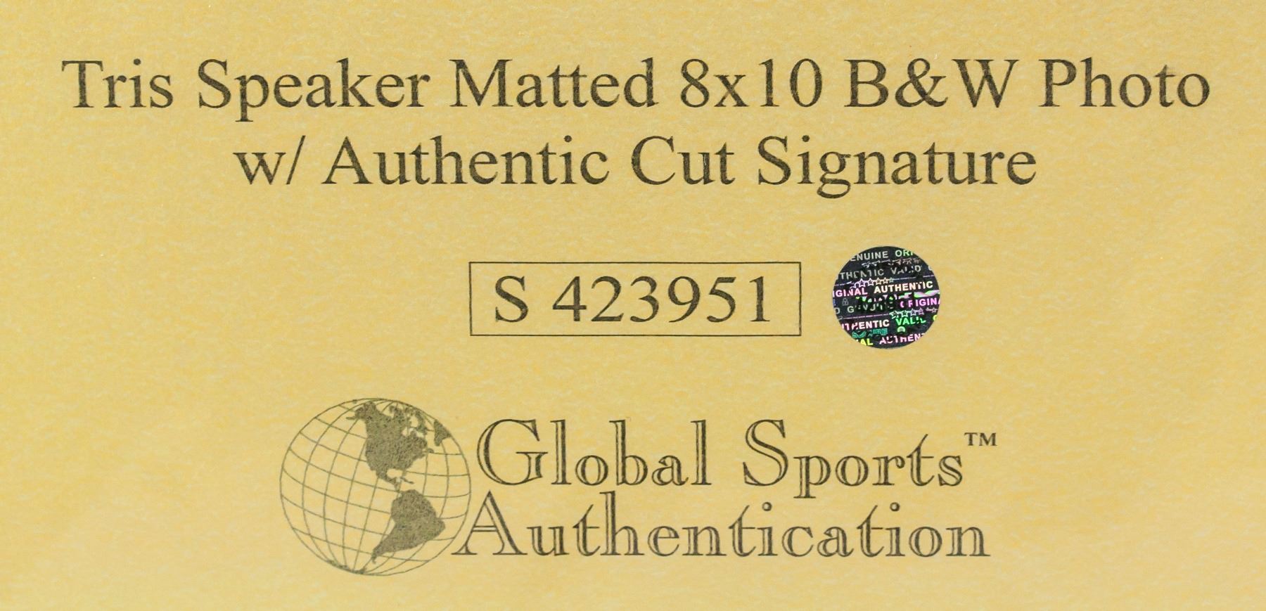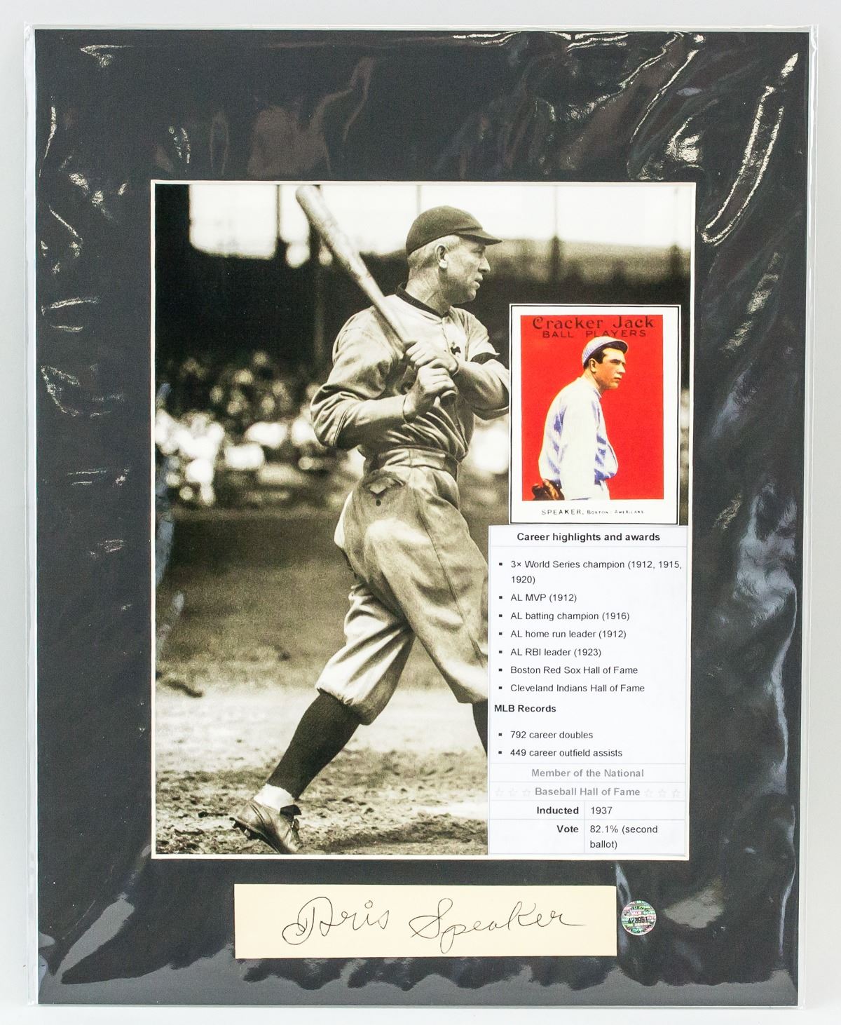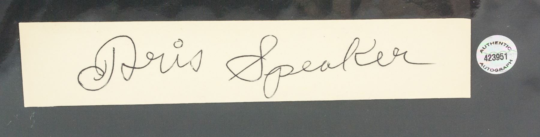 Tris Speaker photo, autograph, and list of career highlights. Accompanied with certificate of authentication. Item size: 36 x 28 cm (14 x 11 in), Signature size: 3 x 14 cm