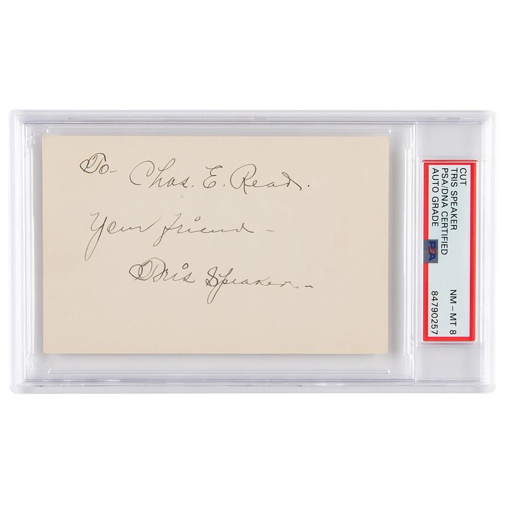 Vintage ink signature and inscription, "To-Chas. E. Read, your friend, Tris Speaker,& rdquo; on an off-white 5 x 3.25 card. In very fine condition. Encapsulated and graded by PSA/DNA as "NM-MT 8."